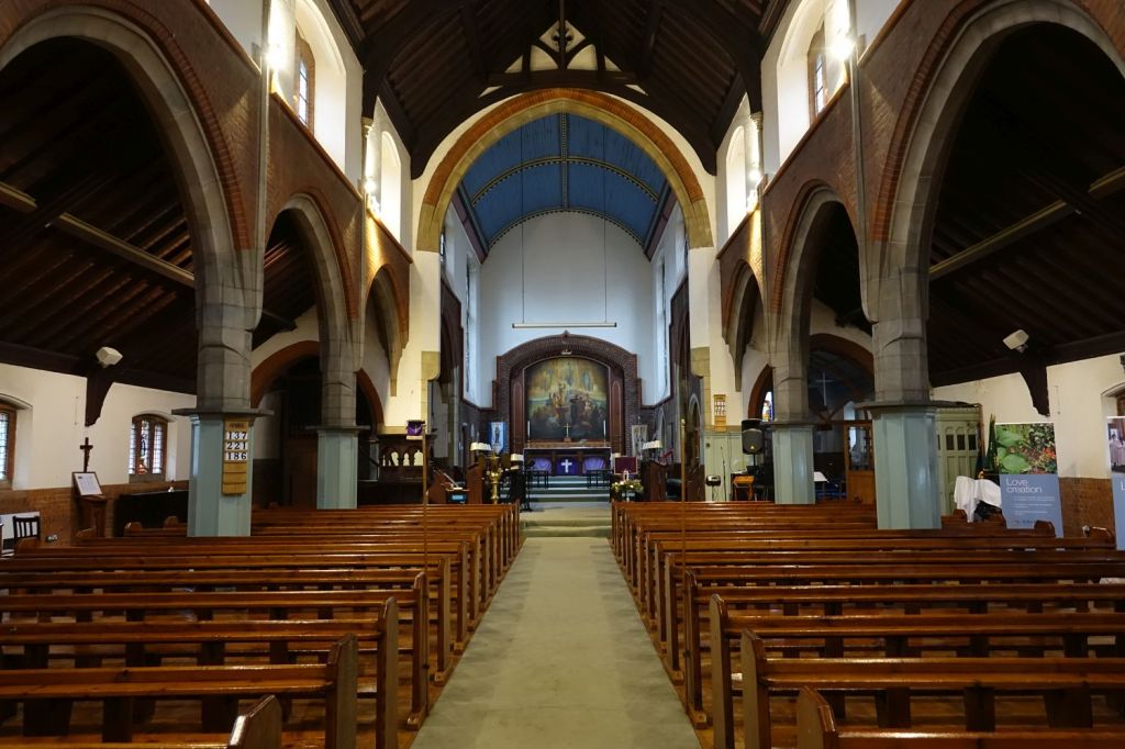 Well west of the town centre, one of W.D. Caroe’s striking churches, this one dates from 1903.