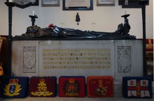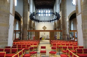 Southend is at the southern end of Catford and this church is on a spacious corner site. In fact, there are two buildings, the older is a former proprietary chapel of 1824 now used as a hall, and the newer the built part of what would have been a huge building by Sir Charles Nicholson dating from 1928. The nave was only partly built and is finished by a permanent “temporary” wall. In 1977 a corona was installed in the centre of the church and the chancel screened off as vestries. However, this change has now been reversed and a high altar restored with a traditional eastward alignment. The north chapel is a memorial chapel to the Forster family who owned the land on which the church is built. This includes a very late recumbent effigy tomb to a son killed at the end of the first world war.