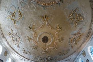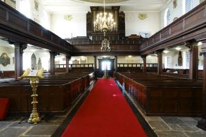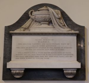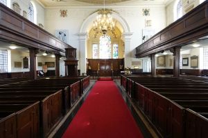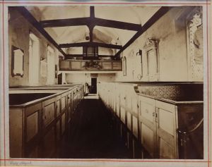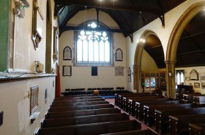 High up with views over Essex and London, by the village green. It dates from 1875-78 and was designed by Basil Champneys. It replaced a small medieval church which is illustrated inside and below. A number of memorials from that church, mostly early 19th century are reset in this building. Inside the chancel no longer has choir stalls