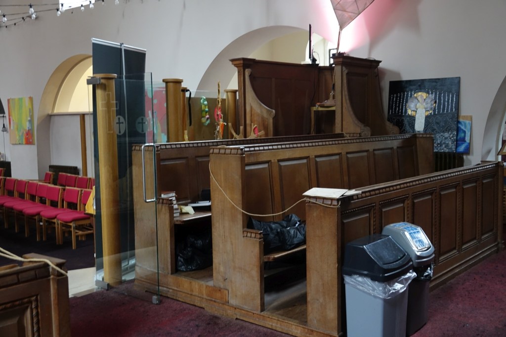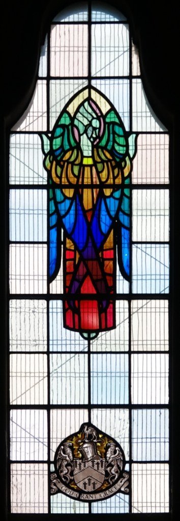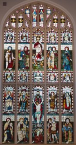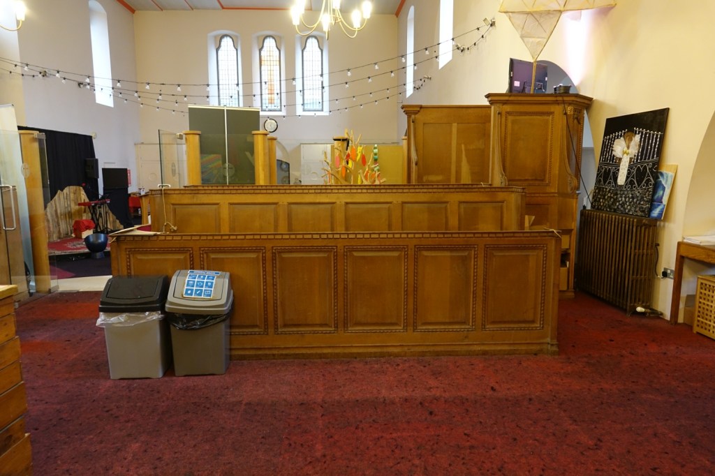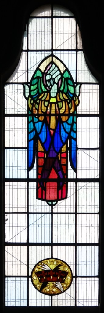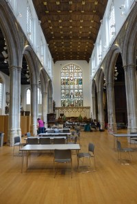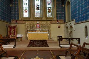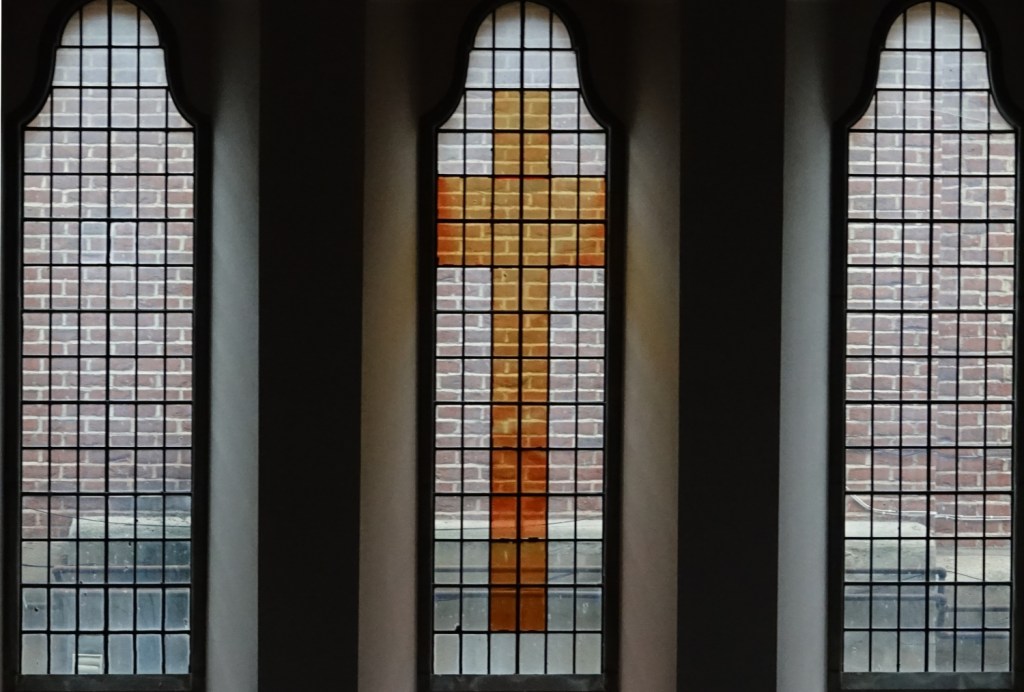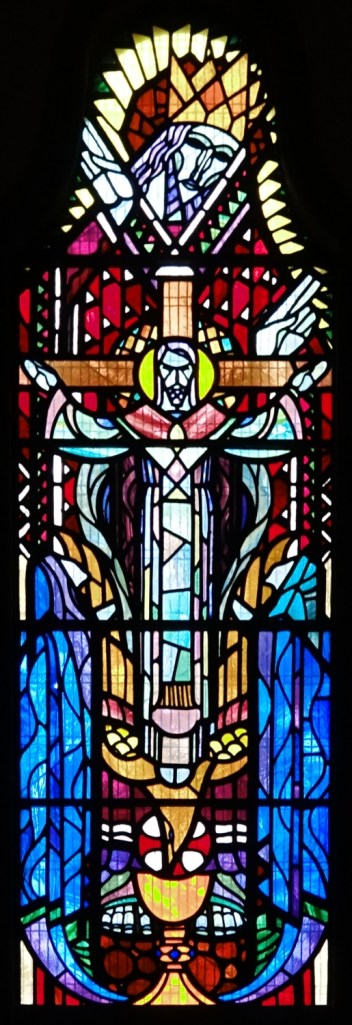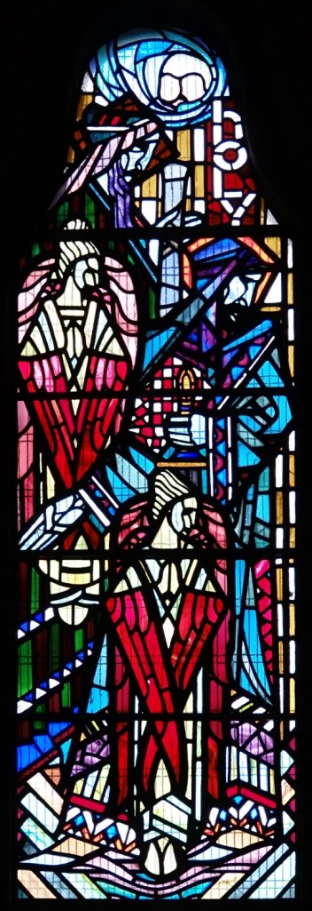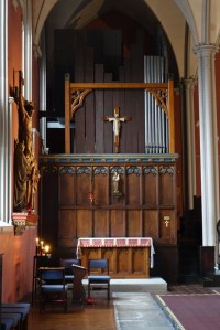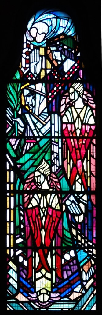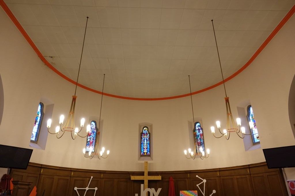 A church of 1873-74 by Ewan Christian, badly damaged in WW2 and rebuilt 1954-55 by A.P. Robinson of Caroe and Partners. At the rebuilding, the chancel was refurbished as the worship space and divided off by a glass screen from the nave which became a hall. To cope with increased use the nave is now, again, the worship space but facing the south wall, and the chancel is used for a variety of purposes. Outside the wall around the east end has been replaced by a narrow curved public cafe added since my visit in 2013. That set of images is retained at the end as a comparison with the current look of the church.