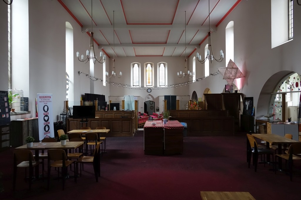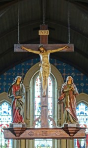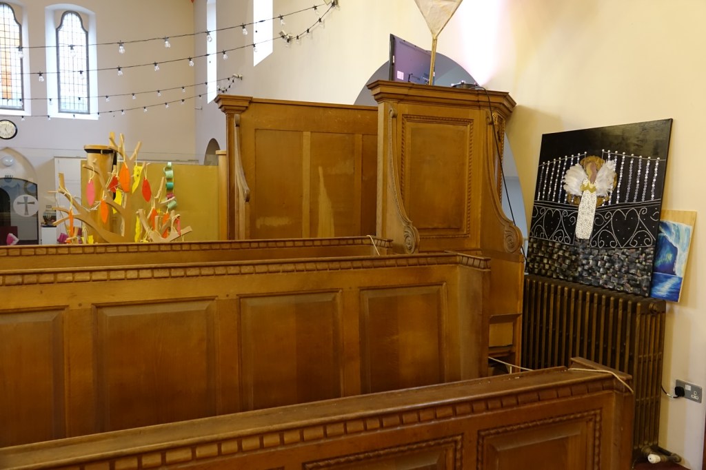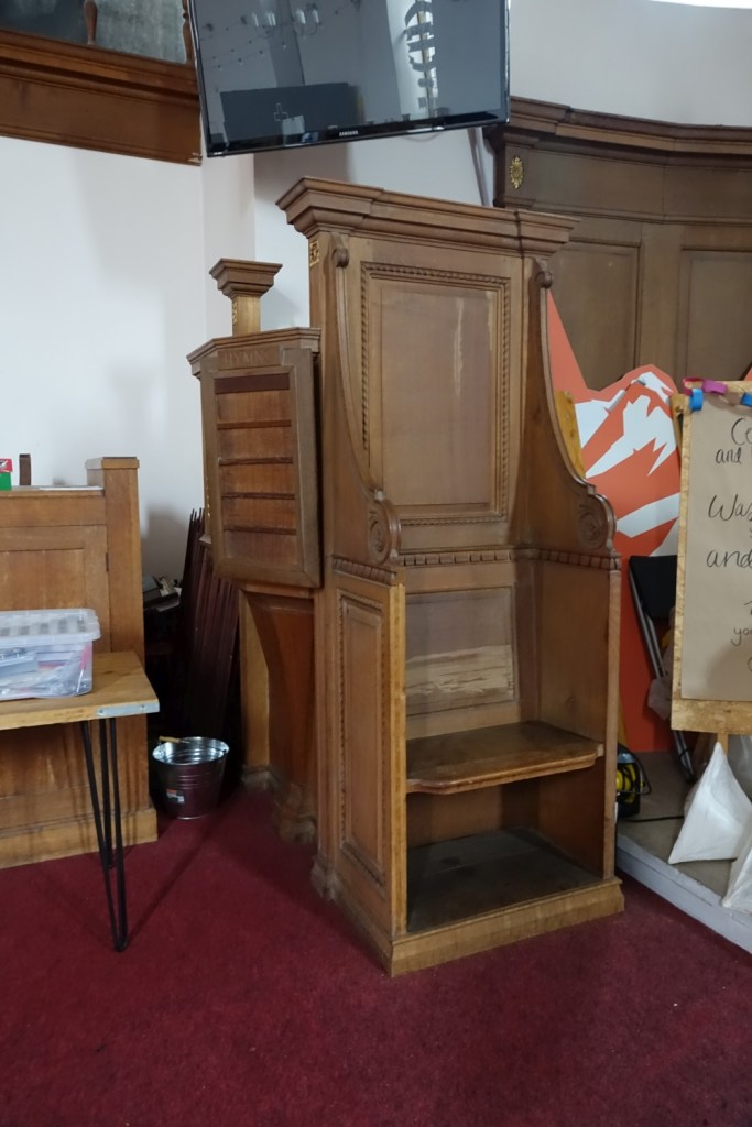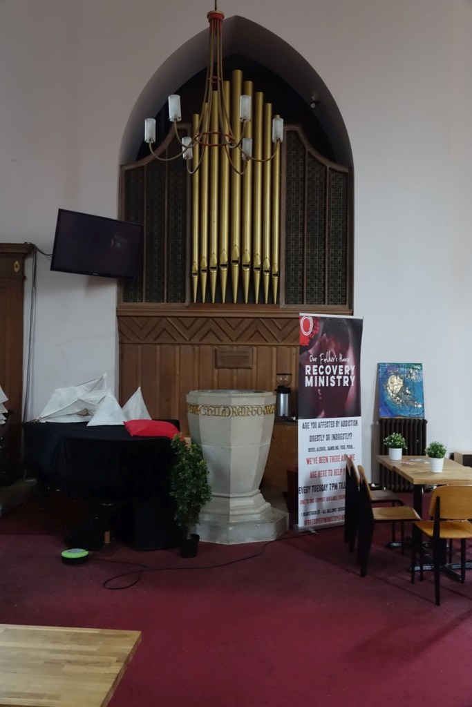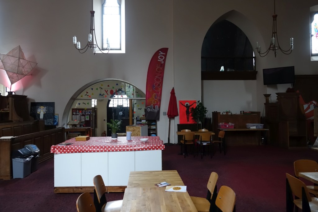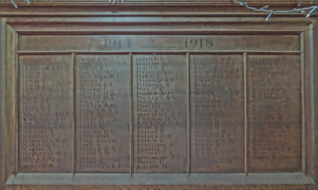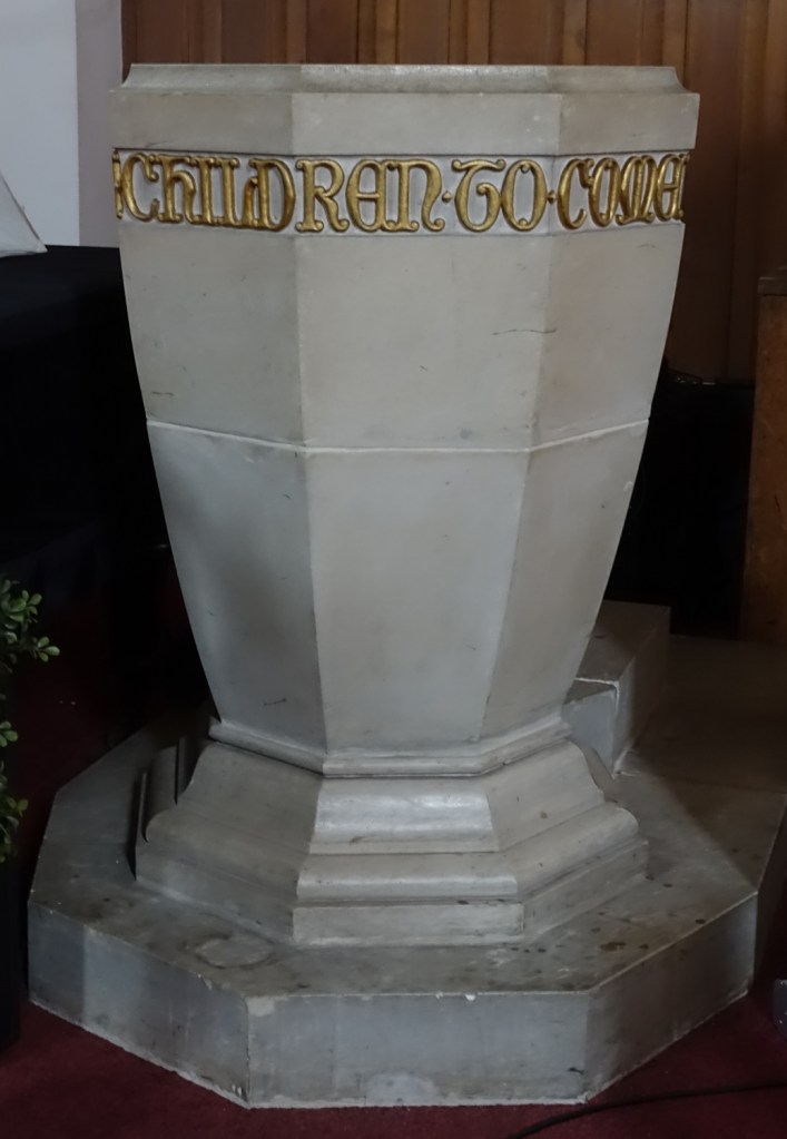 A church of 1873-74 by Ewan Christian, badly damaged in WW2 and rebuilt 1954-55 by A.P. Robinson of Caroe and Partners. At the rebuilding, the chancel was refurbished as the worship space and divided off by a glass screen from the nave which became a hall. To cope with increased use the nave is now, again, the worship space but facing the south wall, and the chancel is used for a variety of purposes. Outside the wall around the east end has been replaced by a narrow curved public cafe added since my visit in 2013. That set of images is retained at the end as a comparison with the current look of the church.