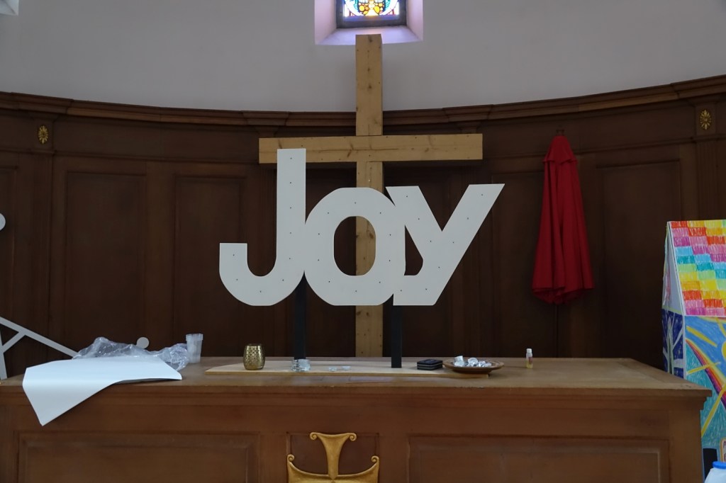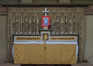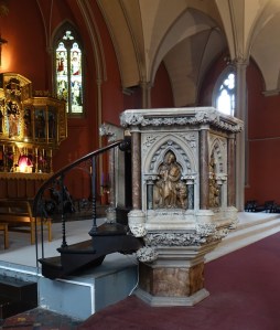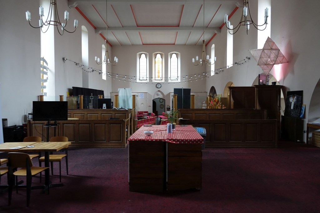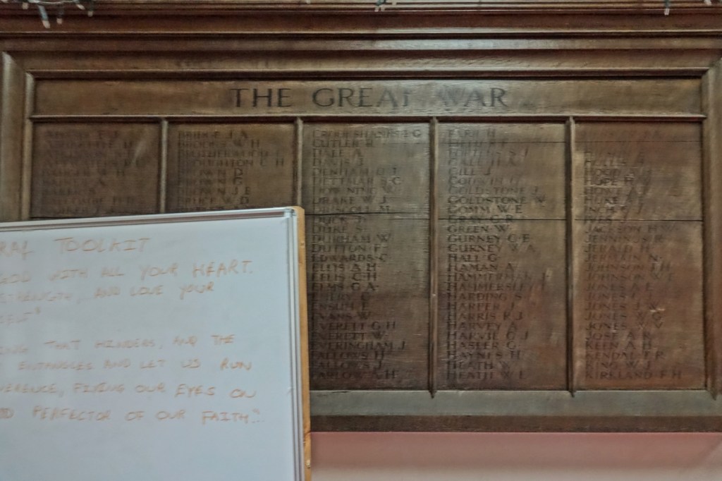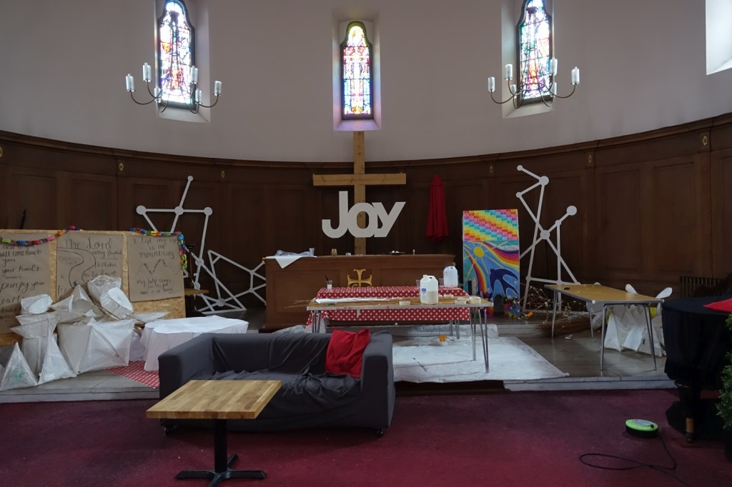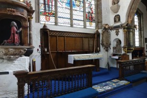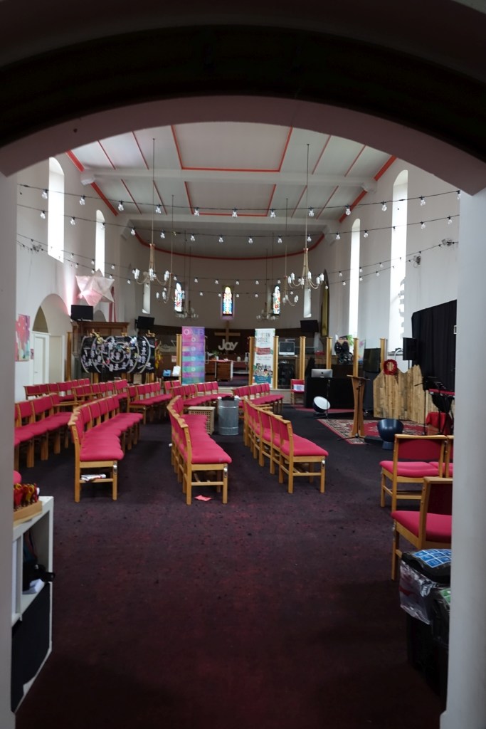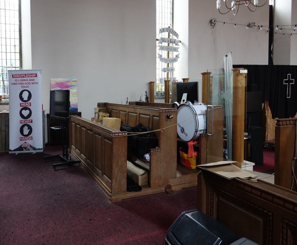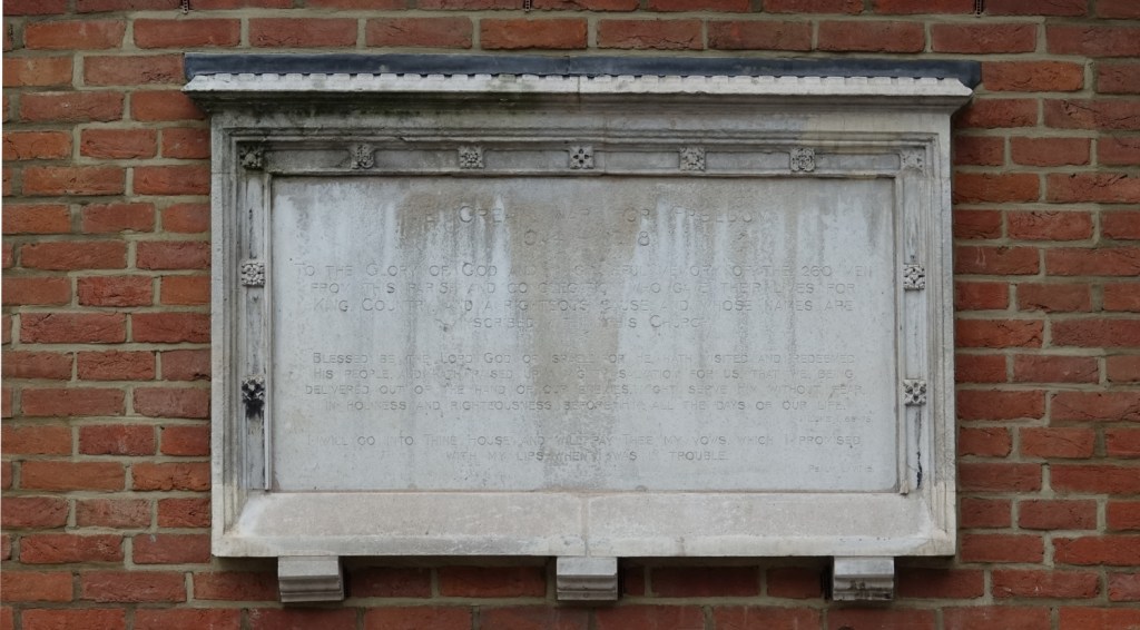 A church of 1873-74 by Ewan Christian, badly damaged in WW2 and rebuilt 1954-55 by A.P. Robinson of Caroe and Partners. At the rebuilding, the chancel was refurbished as the worship space and divided off by a glass screen from the nave which became a hall. To cope with increased use the nave is now, again, the worship space but facing the south wall, and the chancel is used for a variety of purposes. Outside the wall around the east end has been replaced by a narrow curved public cafe added since my visit in 2013. That set of images is retained at the end as a comparison with the current look of the church.