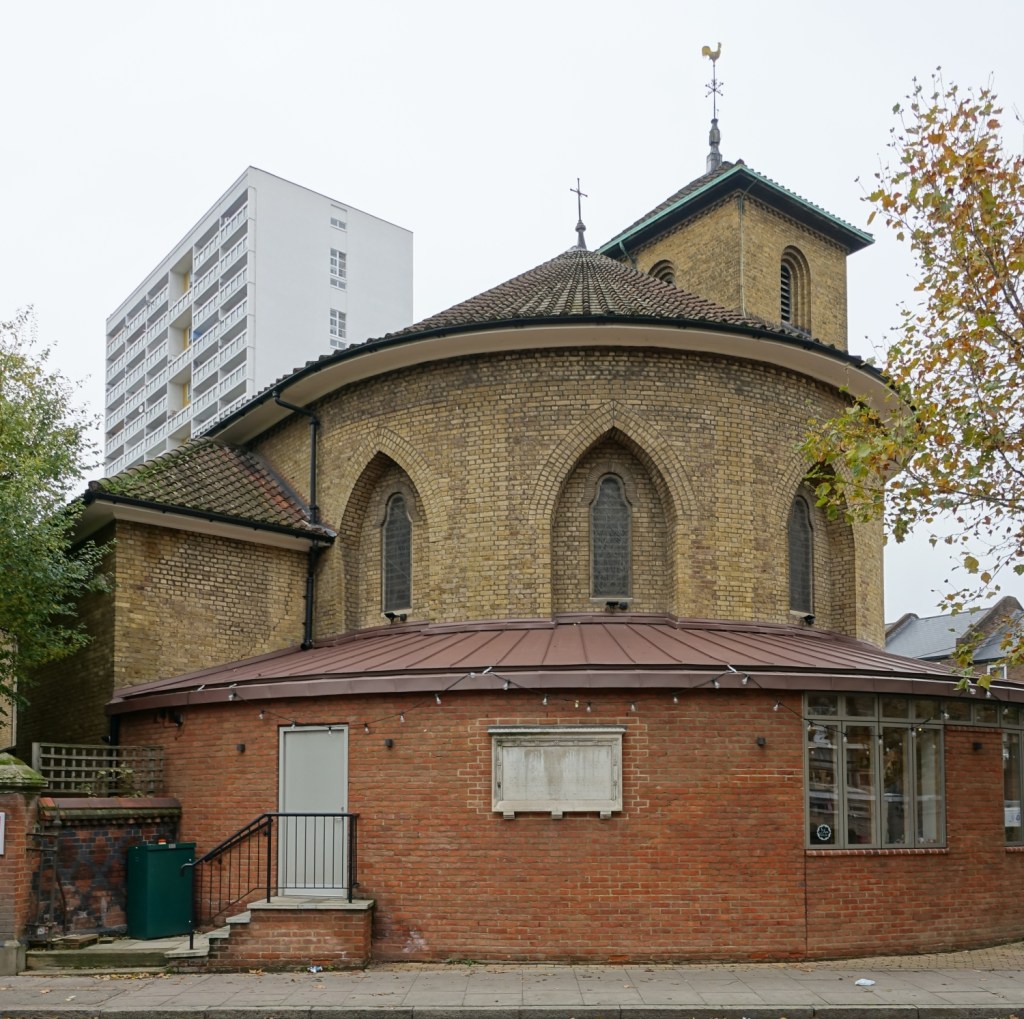 1888-89 by Ewan Christian to serve the expanding suburbs and provide a higher church alternative to many other Islington churches. The current church hall was a Mission Church that was moved backwards after the church was built (last two images). There were more ancillary buildings around the east end but several have now gone. Church website