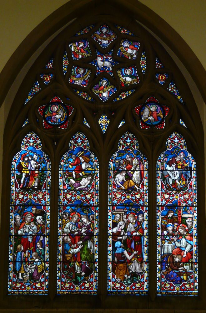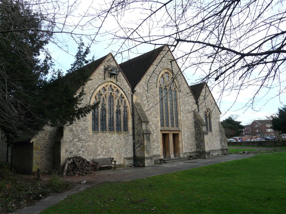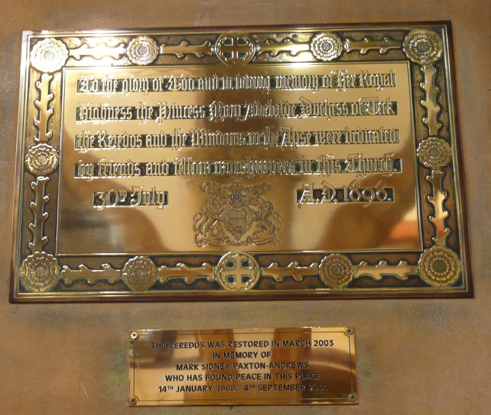 A church of 1873-74 by Ewan Christian, badly damaged in WW2 and rebuilt 1954-55 by A.P. Robinson of Caroe and Partners. At the rebuilding, the chancel was refurbished as the worship space and divided off by a glass screen from the nave which became a hall. To cope with increased use the nave is now, again, the worship space but facing the south wall, and the chancel is used for a variety of purposes. Outside the wall around the east end has been replaced by a narrow curved public cafe added since my visit in 2013. That set of images is retained at the end as a comparison with the current look of the church.