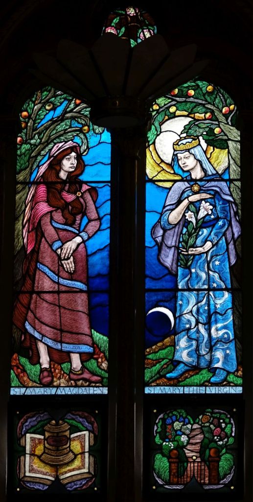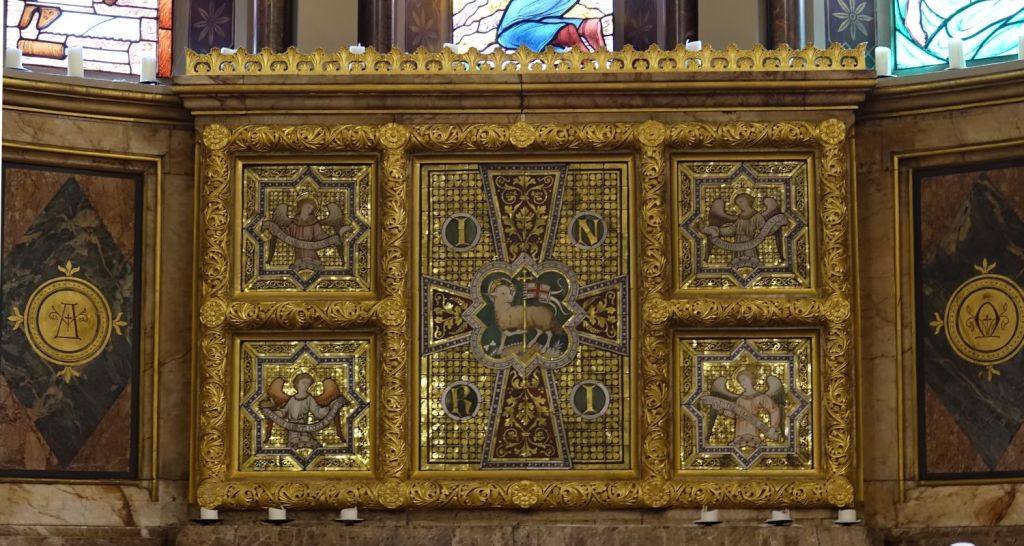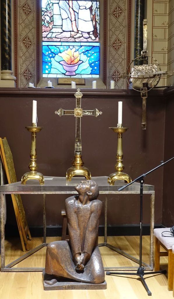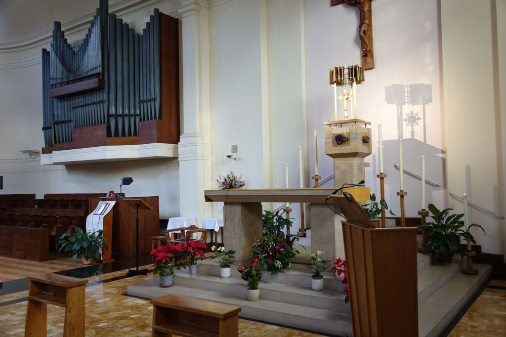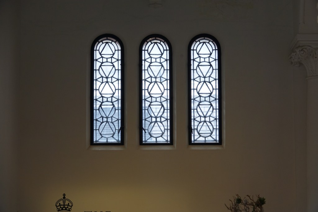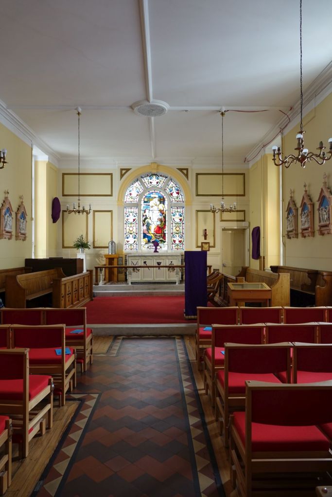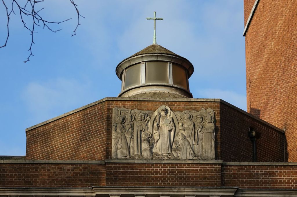 The current building is by F.G. Broadbent and dates from 1958-1962, based on H.S. Goodhart-Rendel’s designs. The chapel is divided by a grille between the lay nave and the nun’s sanctuary area.