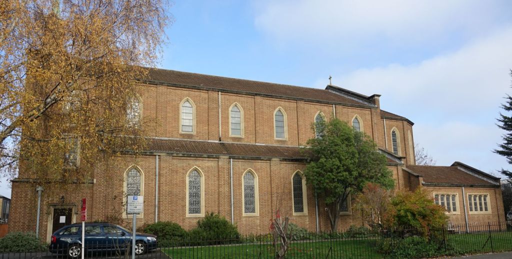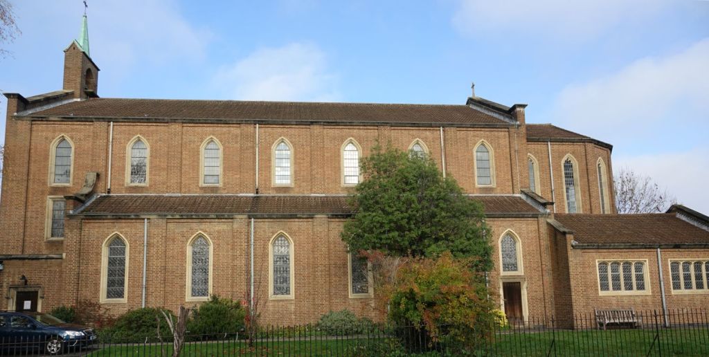 Close to Raynes Park station. It is a church of 1958 by Sebastian Comper, replacing one of Ernest Shearman’s, a1909 church that had suffered war damage. It retains that church’s foundation stone, a figure of Christ, and the Lady Chapel reredos.