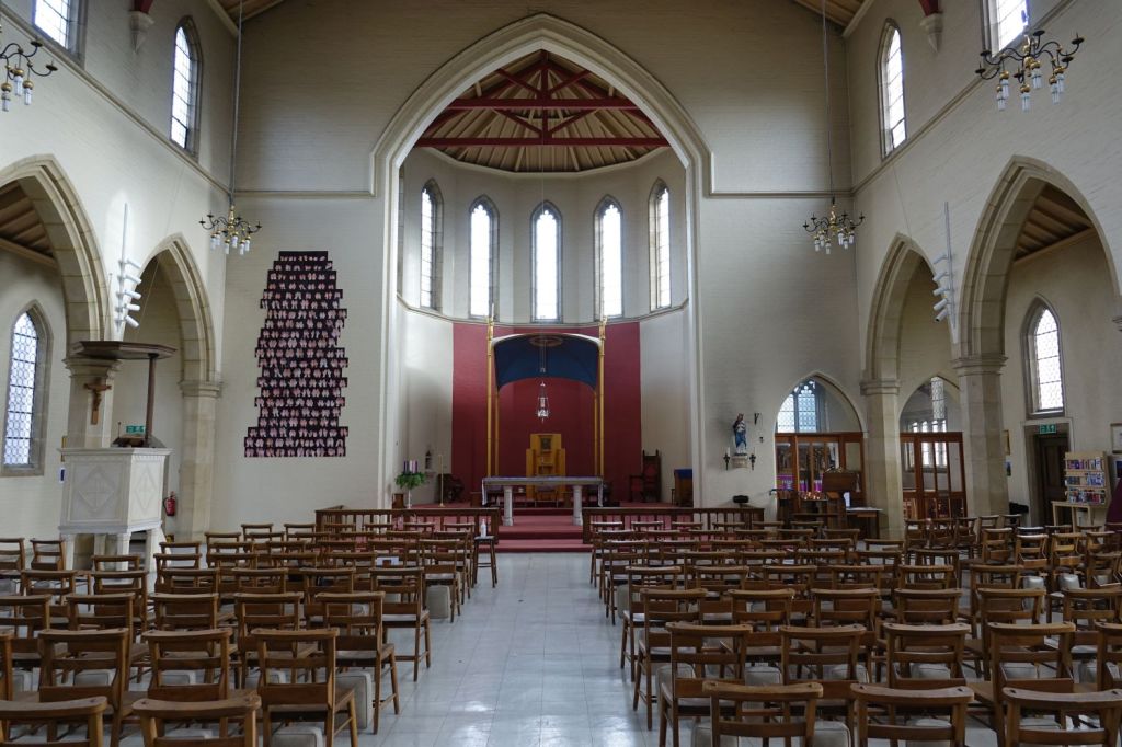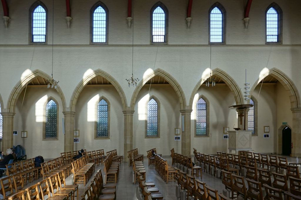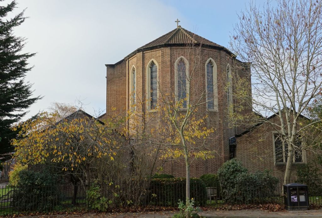 Alongside the Grand Union Canal this is one of George Edmund Street’s masterpieces dating from 1868-1878. It is fitted onto an awkwardly shaped site, defined by now demolished streets. Most of the glass was designed by Henry Holliday and made by Heaton, Butler and Bayne. The south aisle of the crypt (the bottom 10 pictures) was made into the chapel of St Sepulchre by Ninian Comper in 1895, it was renovated by Sebastian Comper in 1967. When I visited in 2012 this was in need of restoration, which was carried out in 2019. At that time the west end gained an extension called Grand Junction containing a cafe and community facilities. The top set of images is from 2025 and the lower set is from 2012.