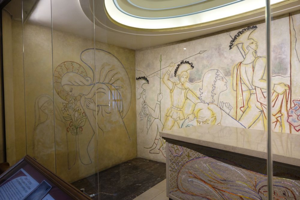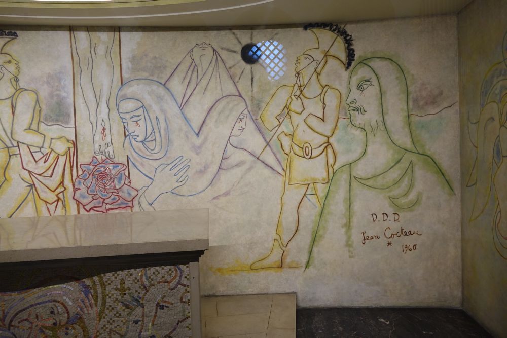 dating from 1951-55 it is by H.O. Corfiato and serves the French speaking catholic community. It forms the lower part of a block of flats, but the church itself is circular. The great treasure is the set of paintings by Jean Cocteau in the Lady chapel which were added in 1960
