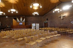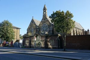 A short way north of the town centre. The original church of 1851-1852 by S.S. Teulon, having closed in 1978 was badly damaged by fire in 1985 leaving the west end of the nave to be incorporated in a new building of 1991 by Maurice Taylor. The old church section is now a hall and the newer section, the worship area.