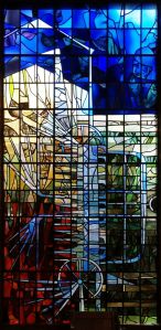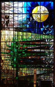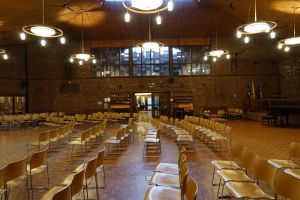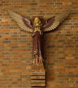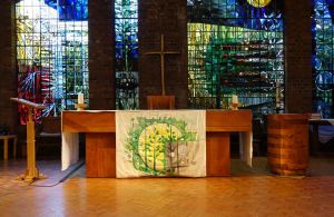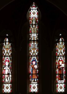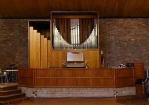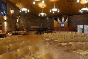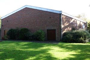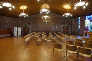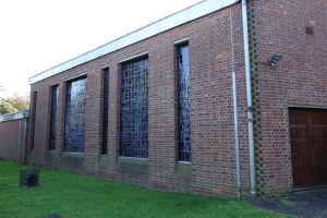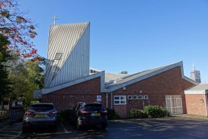 Southeast of the town centre in leafy suburbia, this church replaced a 19th-century building on the edge of the town centre. The architect was David Bush and it was built as a complex of halls, offices and church in 1965-72. It was originally orientated towards the wall that now features two fire doors. Their insertion led to the altar being moved in front of John Hayward’s stained glass windows. Some choir pews and two angels, as well as some of the glass re-used in the windows, remain from the previous church.