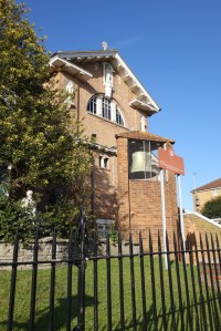 High up on the ridge above Gladstone Park, this is a church of 1932 by Bedingfield & Grundy. The steep side means that the church is above halls built below.