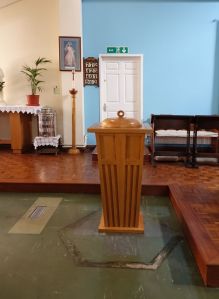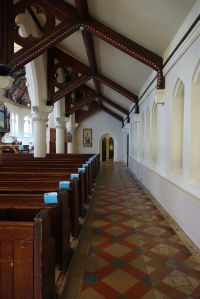 Visible across the Alleyn’s School playing fields, this is a large church of 1995 by L. Malcic of HOK . It replaced a previous church of 1892-1895 destroyed by fire in 1992. All that remains is a small section of wall in the associated hall and office area and the font. The spire is transparent and sits in the centre of the roof over the centrally placed altar. The interior is tall and light with intricate glass by Caroline Swash and a large modern organ. There is also a side chapel near the entrance from the foyer area.