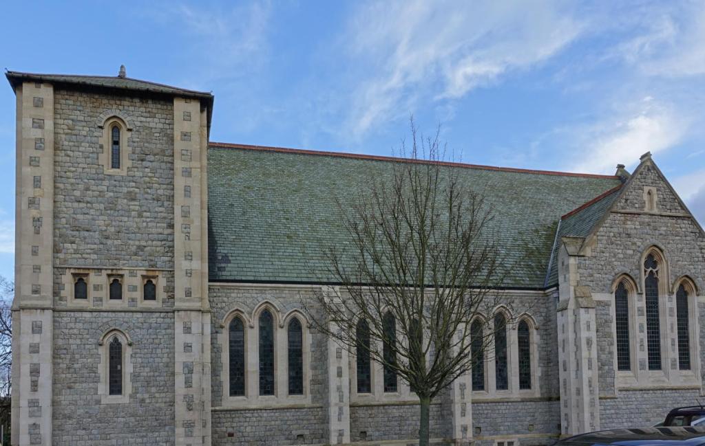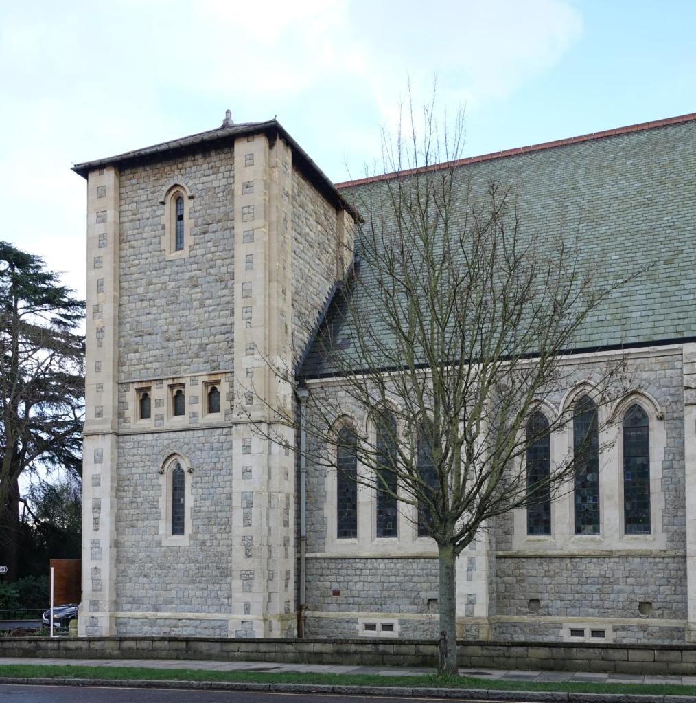 A suburban church at the foot of Gordon Hill north of Enfield Town, by Carpenter & Ingelow 1874, the unfinished west end was completed in 1963.