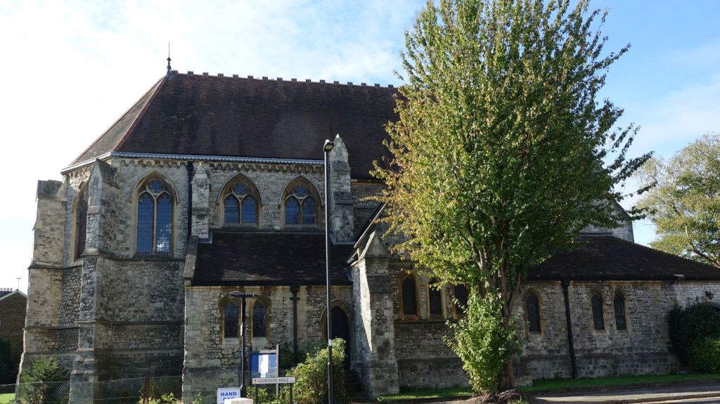 A suburban church at the foot of Gordon Hill north of Enfield Town, by Carpenter & Ingelow 1874, the unfinished west end was completed in 1963.