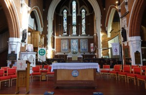 A small APEC multi-purpose centre of 1986-1987, in back streets between Forest Gate and Manor Park. It replaced a 19th century church on the same site. A WW1 memorial window by Lowndes & Drury is on display inside. There is an immersion font below the more conventional font pictured. The banners are made by an in-house group.