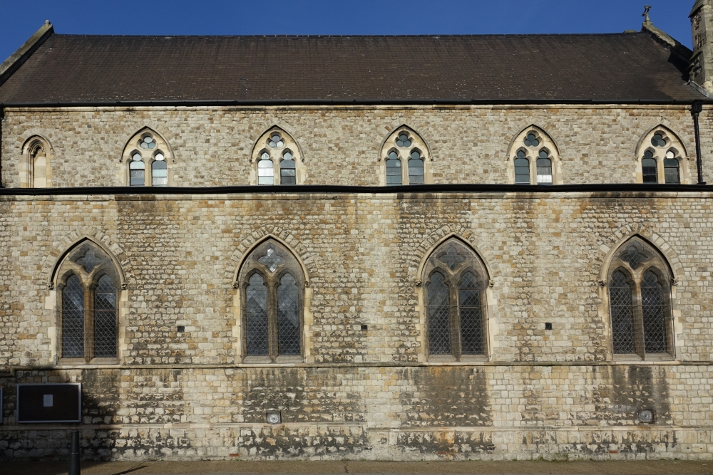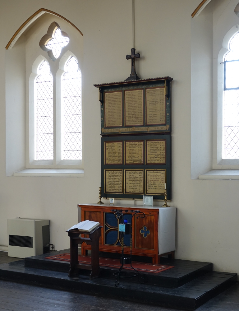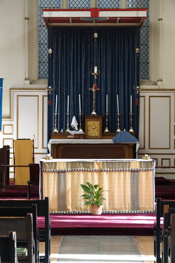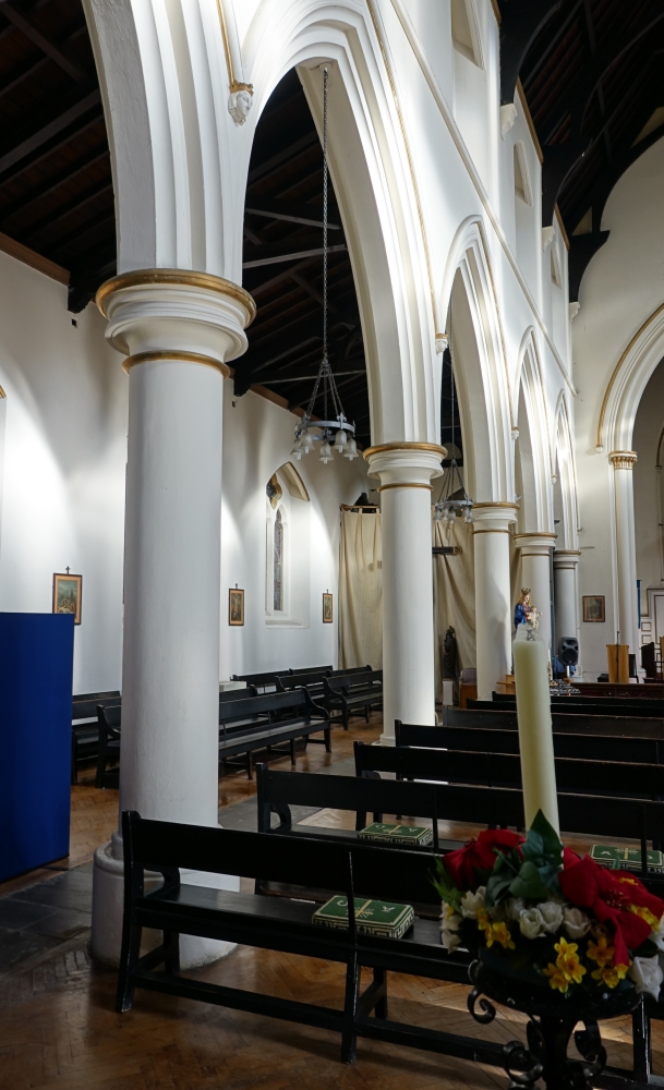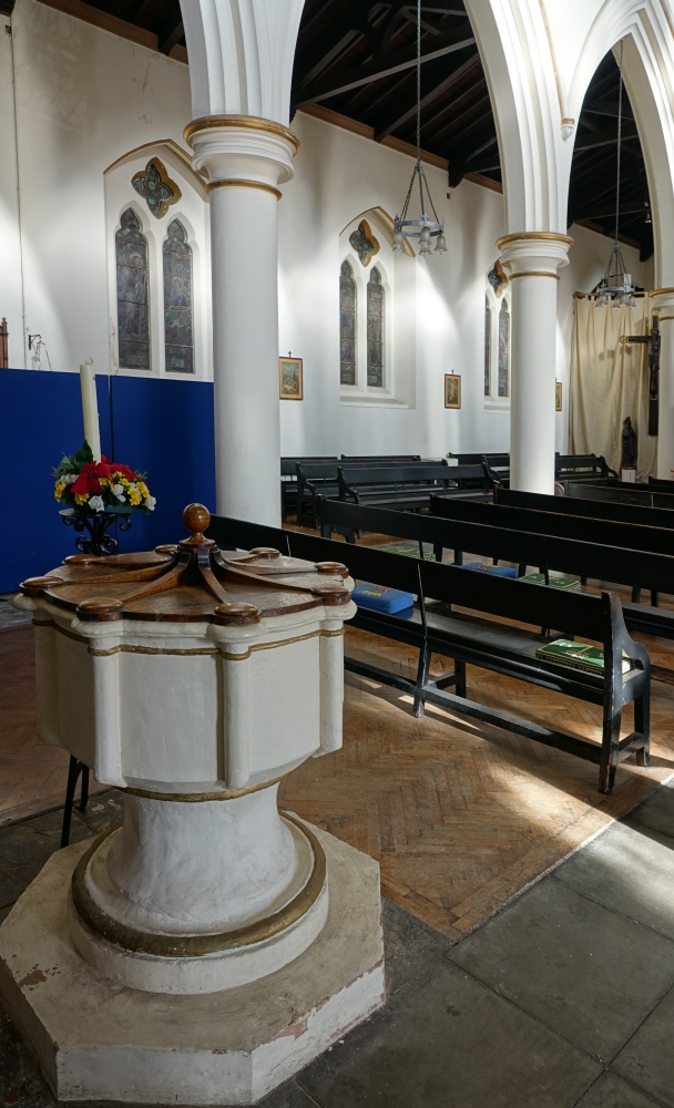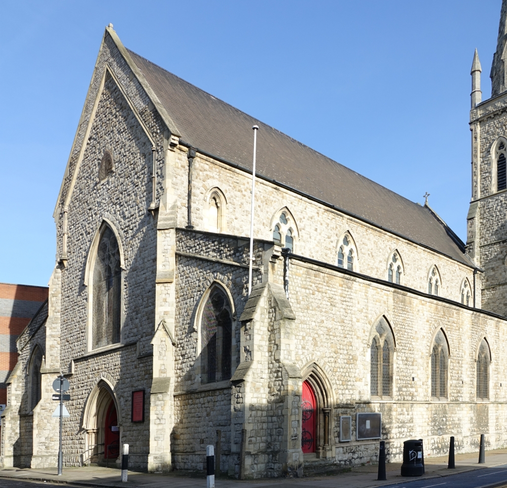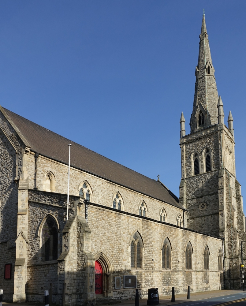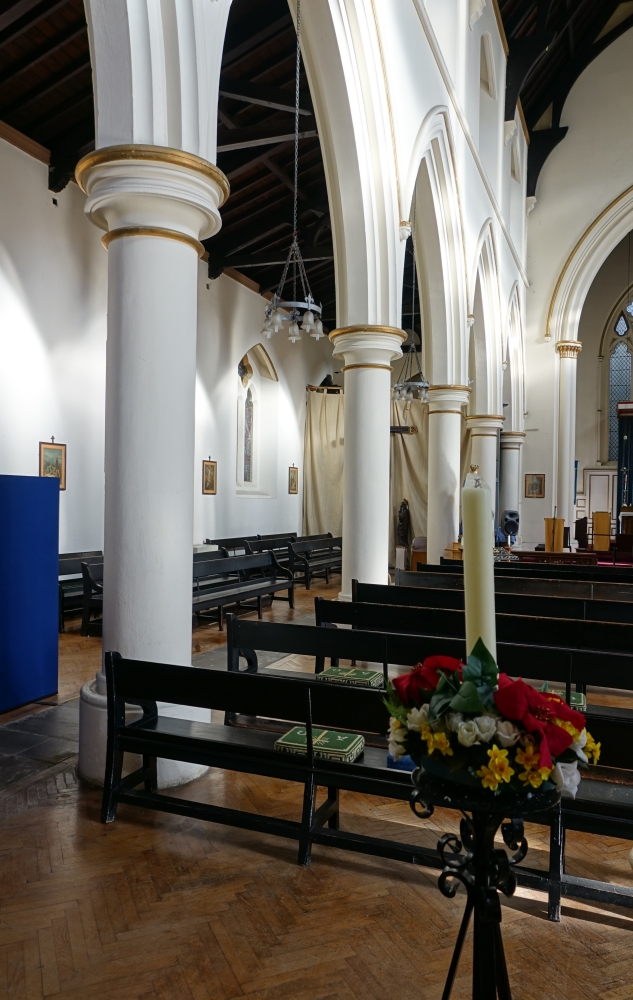 On the corner of Abbey Road and Priory Road a little way east of the High Road. It was designed by F. & H. Francis and built 1857-62. The east window is by Clayton and Bell, much other glass was lost in WW2 but windows from the redundant All Souls, Loudon Road have been reset in some of the space left.