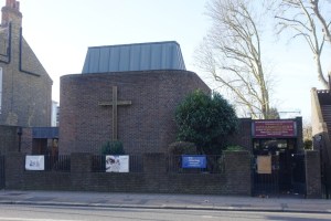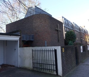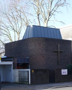 Towards the southern end of Fulham Palace Road. It dates from 1955-58 and is by Guy Biscoe, replacing a church of 1896-97.