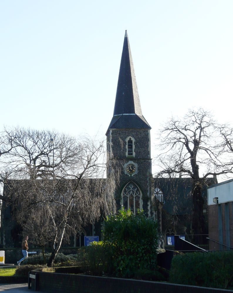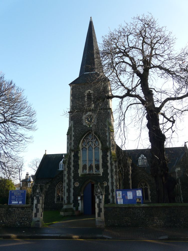 On the high ridge well away from the station in the “villagey” part of Belvedere. Built, originally as a private non denominational chapel, 1853-61 by W.G. and E. Habershon.