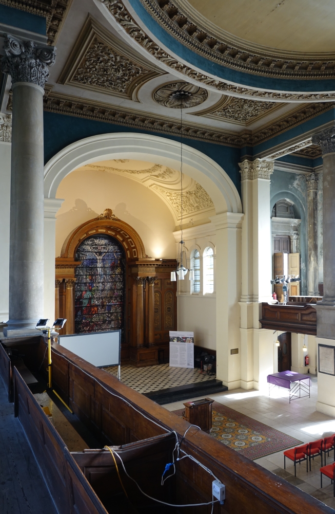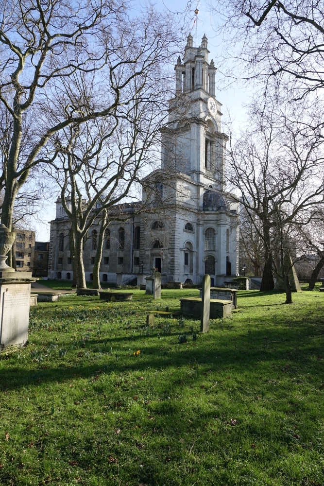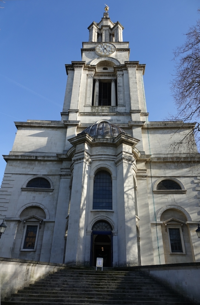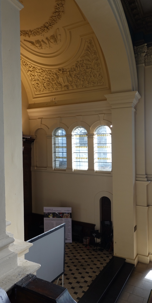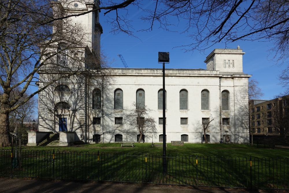 One of Nicholas Hawksmoor’s major east end churches. It was built between 1714 and 1725. Gutted by fire in 1850 it was restored by Philip Hardwick and John Morris in 1850-51, Philip .C. Hardwick (son of the earlier Hardwick) 1856-57. In 1891 Arthur Blomfield undertook a remodelling of the chancel. In 1983-93 it was restored under Julian Harrap. At my 2024 visit the east window had been removed for restoration and replaced by a photo, I have included a 2012 photo to show the actual window.