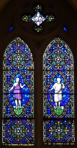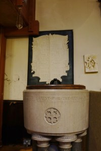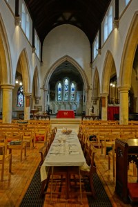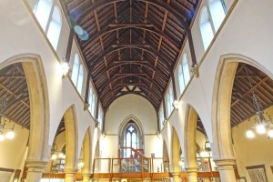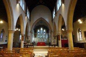 A church of 1864 by A.W. Blomfield with a south aisle added in 1874 and a north aisle in 1912 by J. Stockdale. WW2 damage followed by a fire damaged much of the structure and stained glass and much of the interior and roof were rebuilt in the 1950s. The north aisle has been walled off as a hall, offices, kitchens and toilets, but retains its contemporary early 20th-century stained glass. On my visit, the vicar showed us some old photos which I have copied and added at the end to show the pre-WW2 and then the damaged and restored interior.