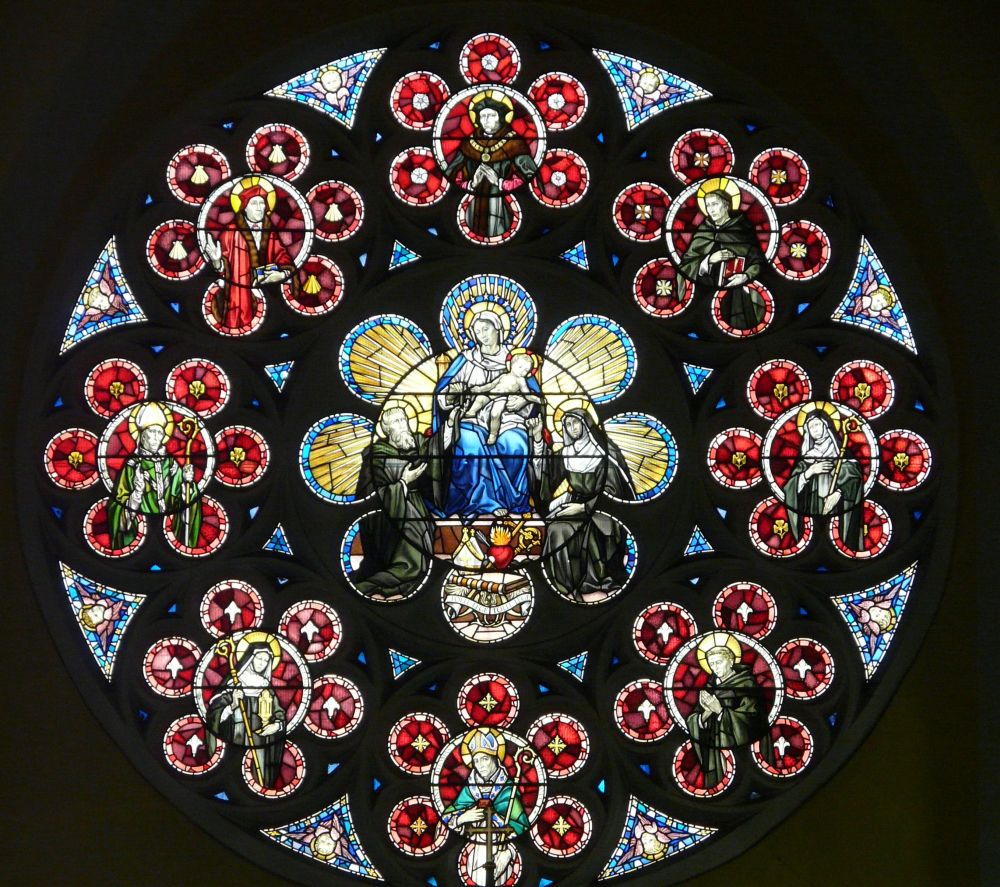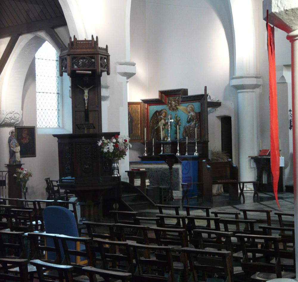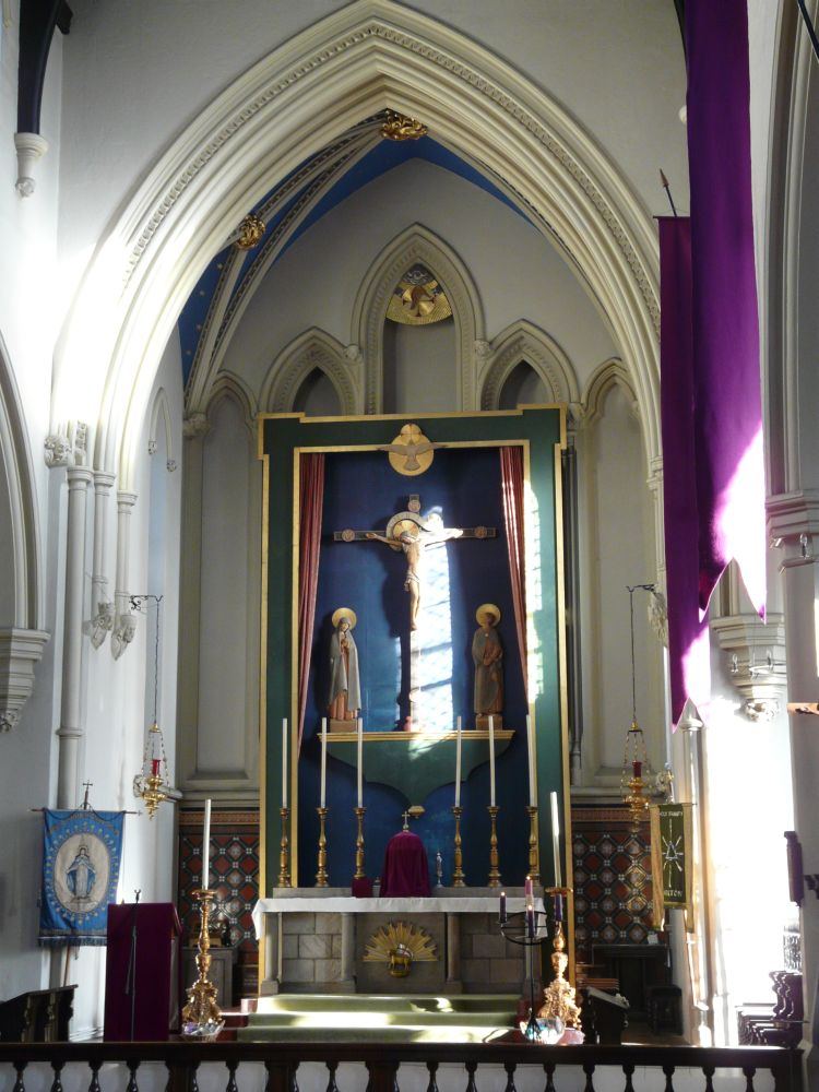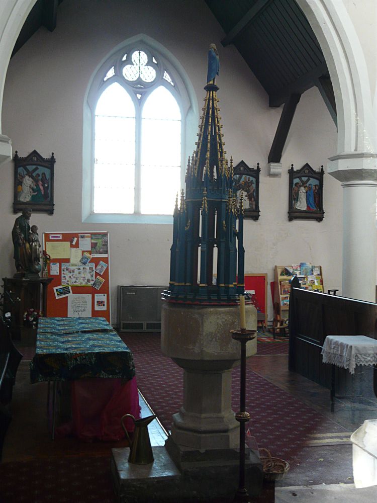 Attached to an Augustinian Priory. The church is by E.W.Pugin and dates from 1864-66, with a lady chapel added by John Young in 1880. The columns and vault are all of wood. The church is being restored and fragments of the original painted decoration have been uncovered.