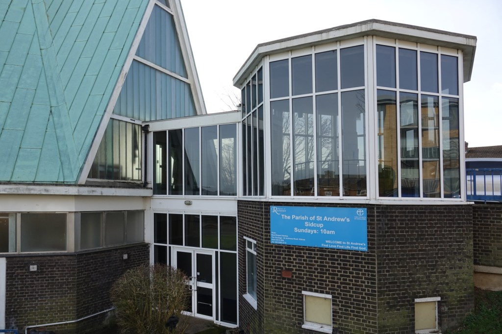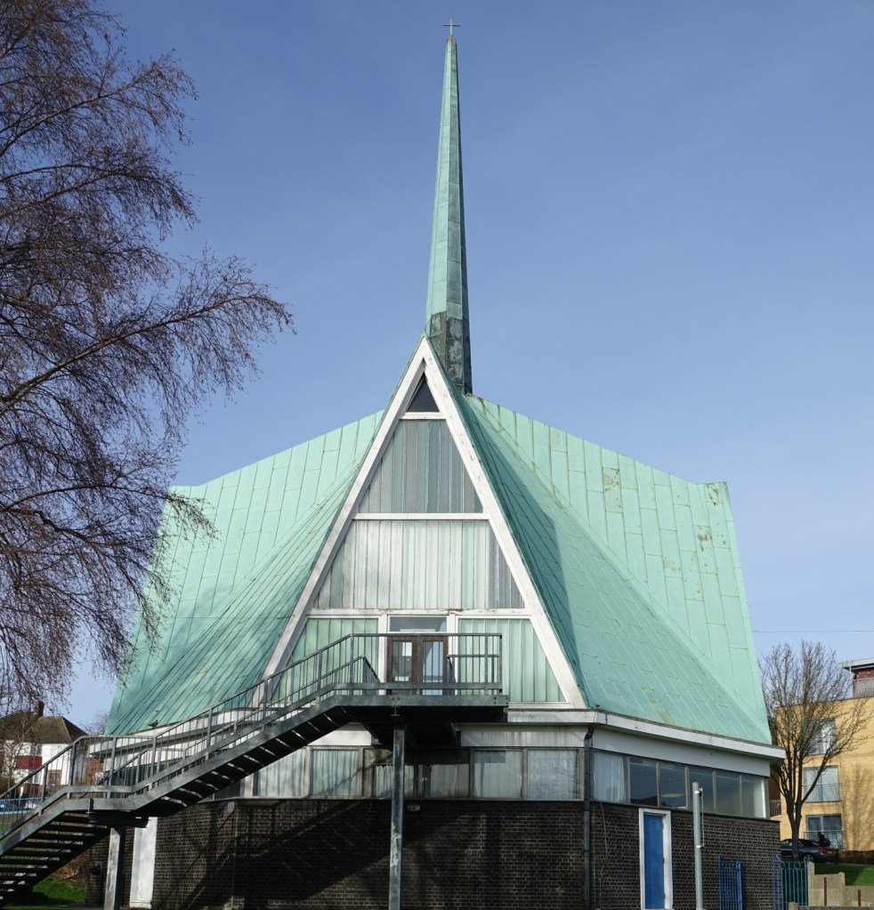 In the Albany Park Estate east of Sidcup. It dates from 1964 by Braddock, Martin-Smith and Lipley. Built on a slope with halls underneath and a church on top. There are now (Jan 2024) only two Anglican services a month and the building is administered by the New Community Church.