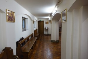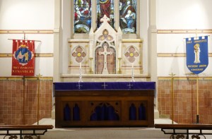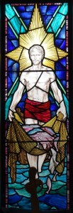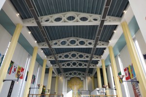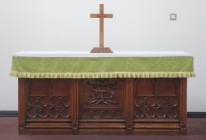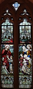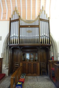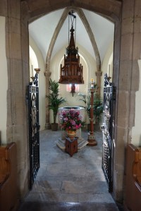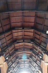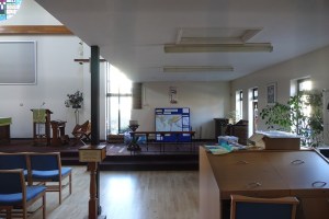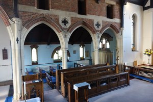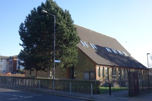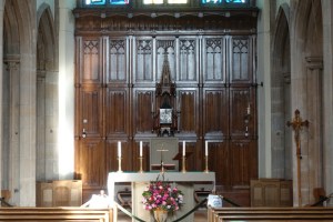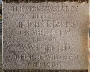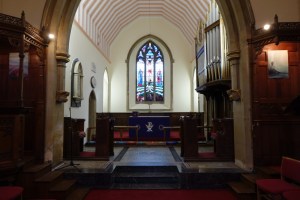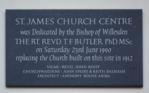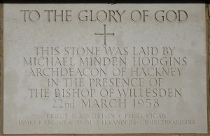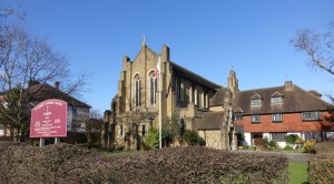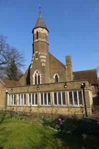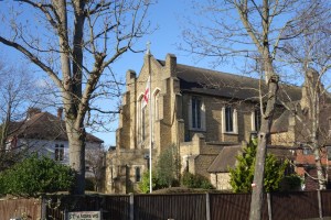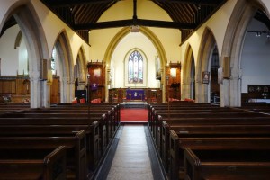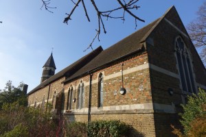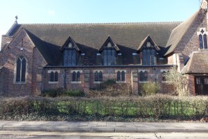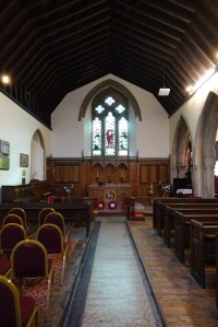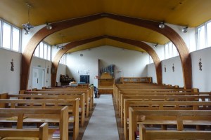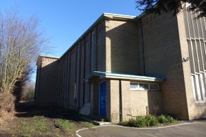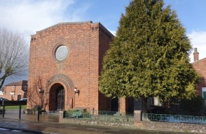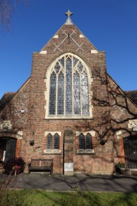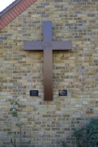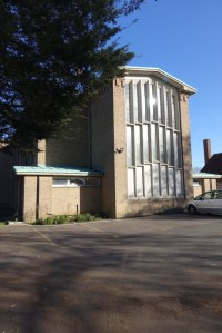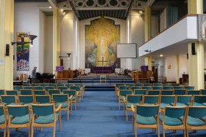 One of the last churches of J. Harold Gibbons being built in 1957. The interior features a Hans Feibusch painting behind the altar. The wooden “serving hatch” doors at the west end can be opened to allow the narthex to be used if there is a high attendance at a service. The hall to one side served as the church from 1937.