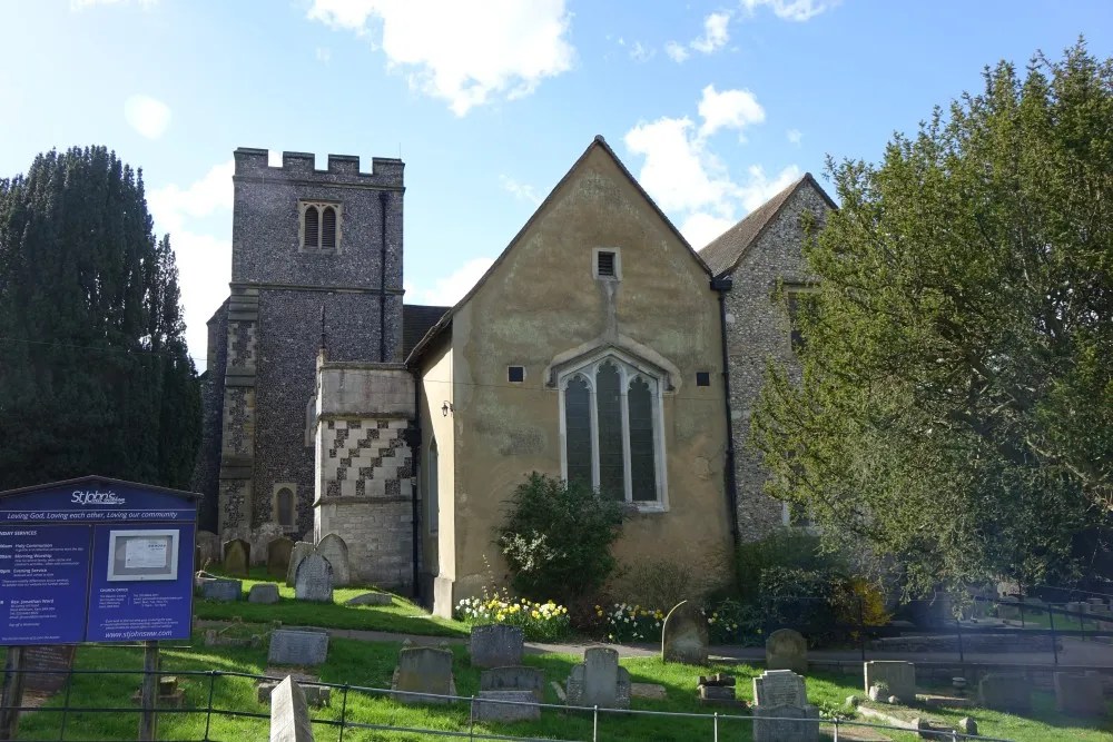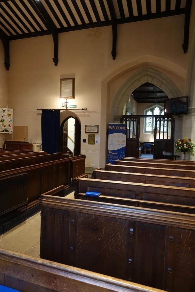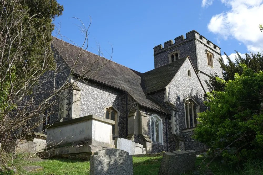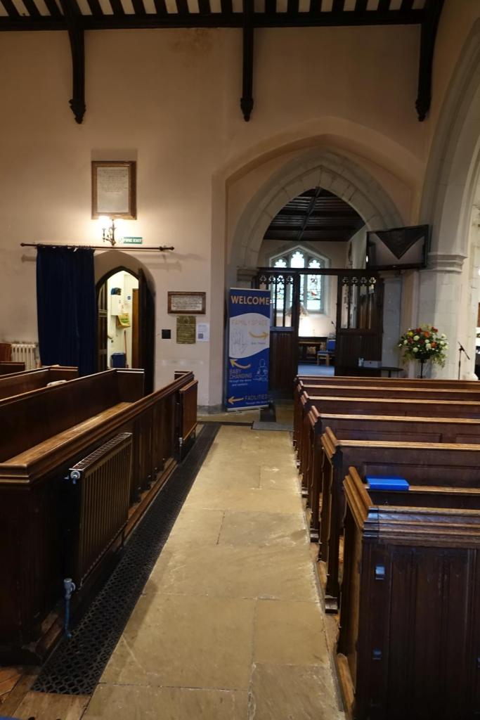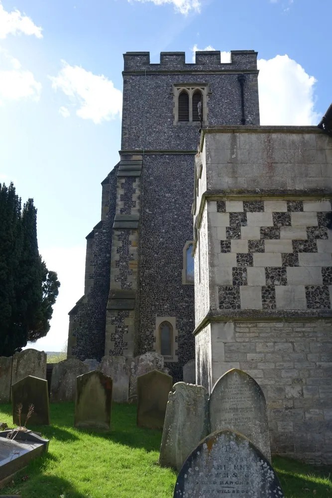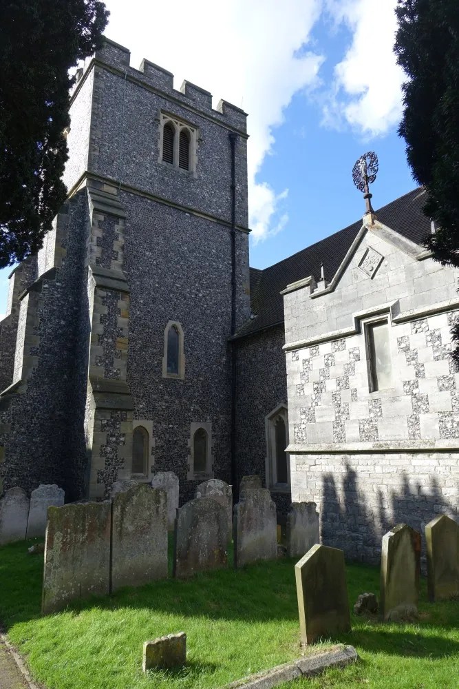 The old village church a mile or so south of the modern town centre on a hill-top, it can still be approached across fields. The nave, north aisle and tower were rebuilt in 1847 by Whichcord and Whichcord.. Sedding added an organ chamber in 1889. A second storey was added to the north chapel in 1961.