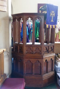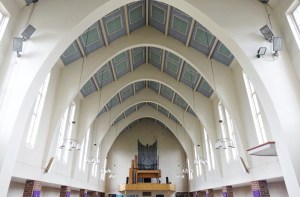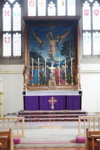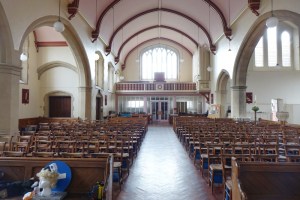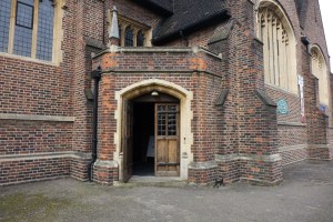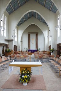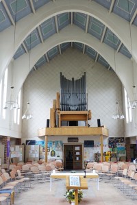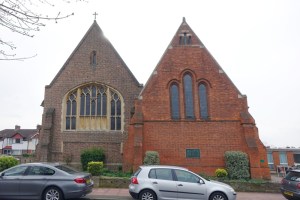 North of the current town centre down a suburban street. The original church, now the hall, was by Martin Travers and built in 1934. The current church of 1954 was designed by C.W. Fowler. There is a first floor lady chapel in the transept like structure between the two. The fish is a fossil in the altar step.