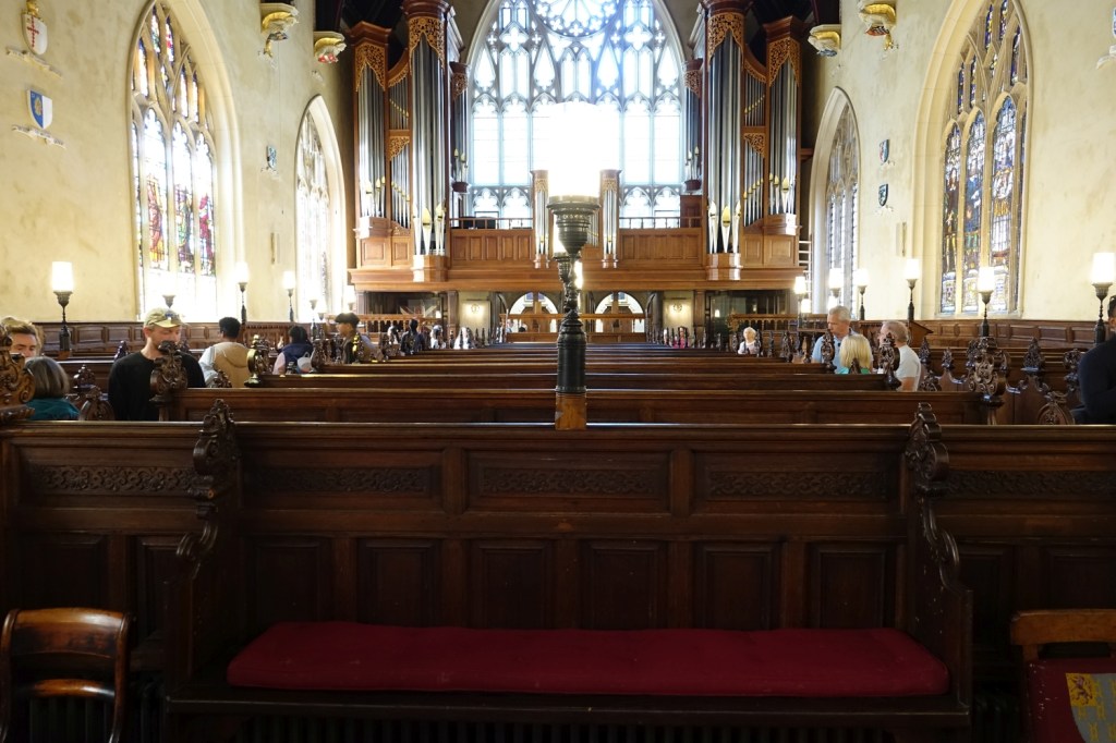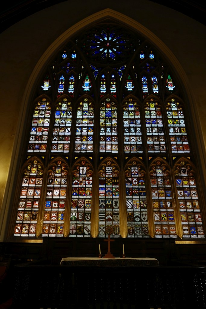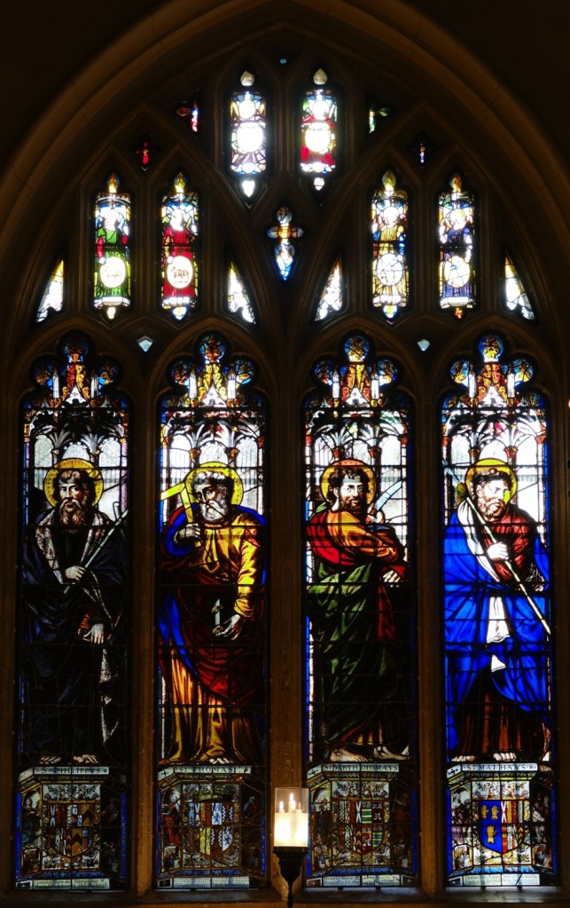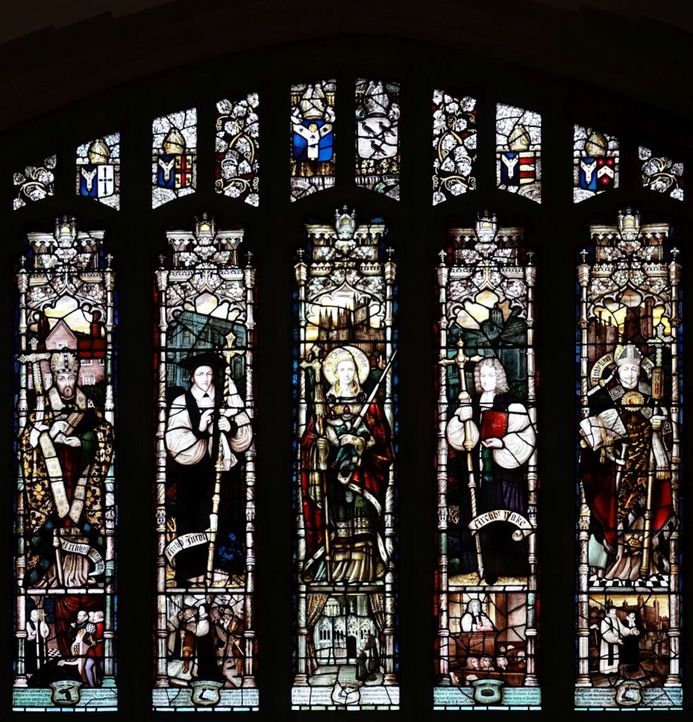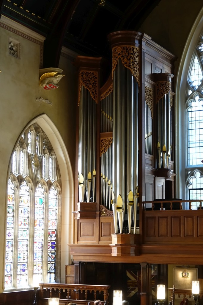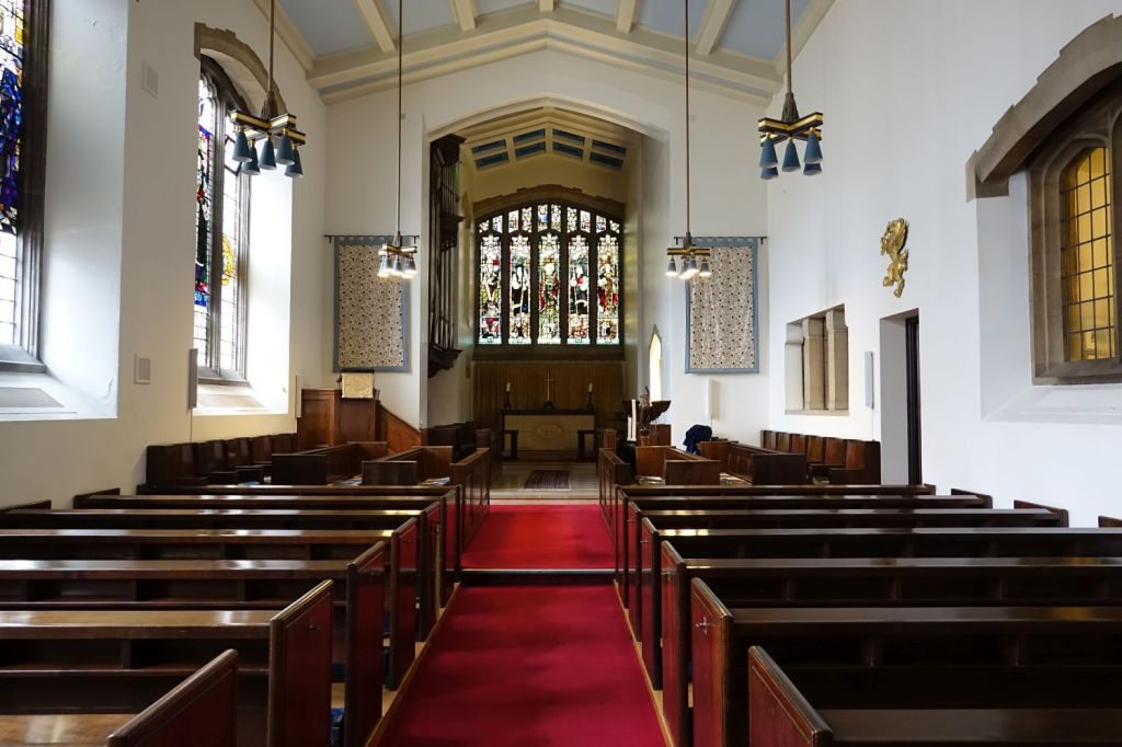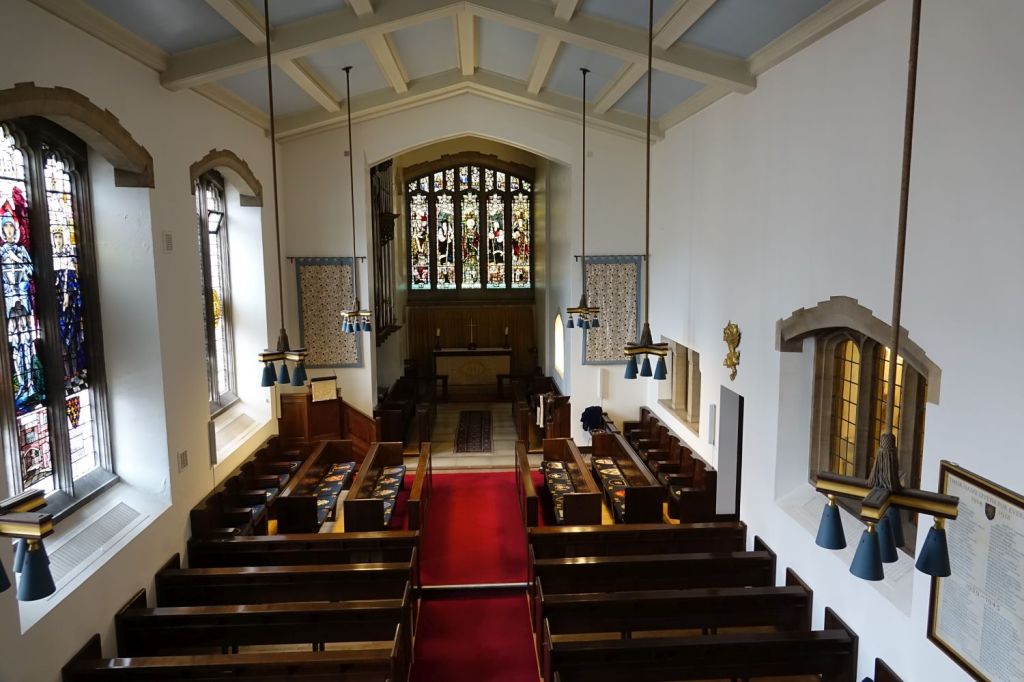 An insignificant-looking exterior, it was rebuilt by Edward Maufe after WW2 damage. Pre-war glass survives as it was taken out for protection and includes windows by Selwyn Image and Christopher Whall.