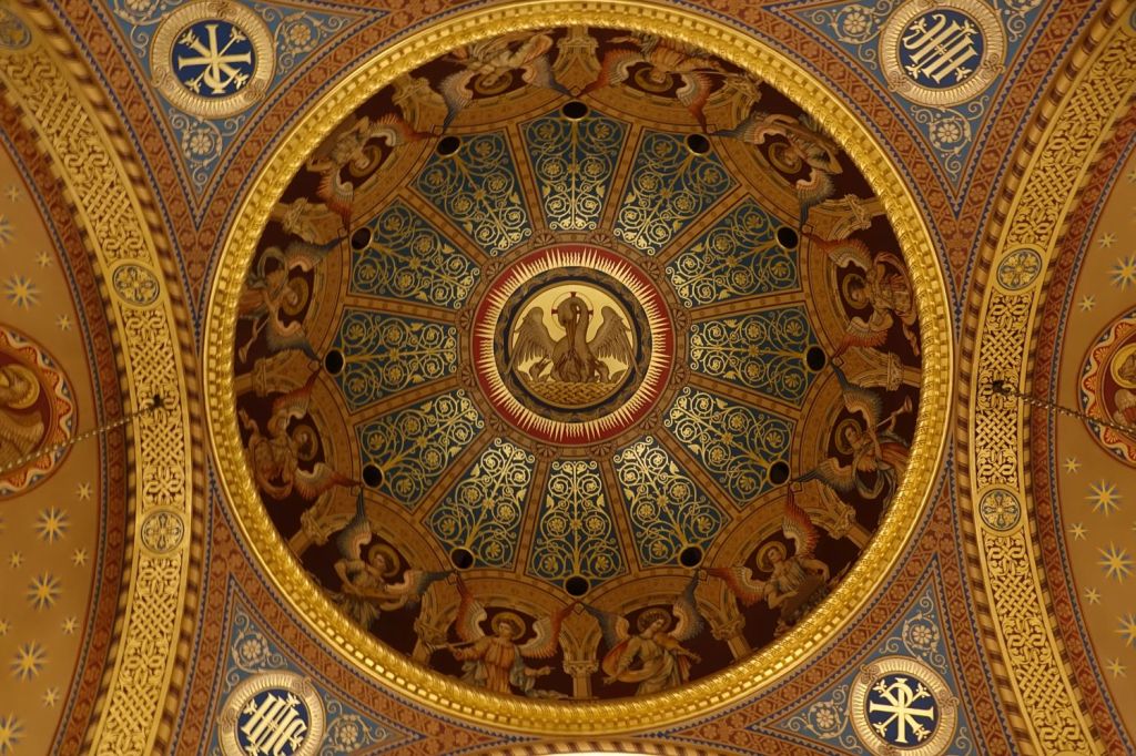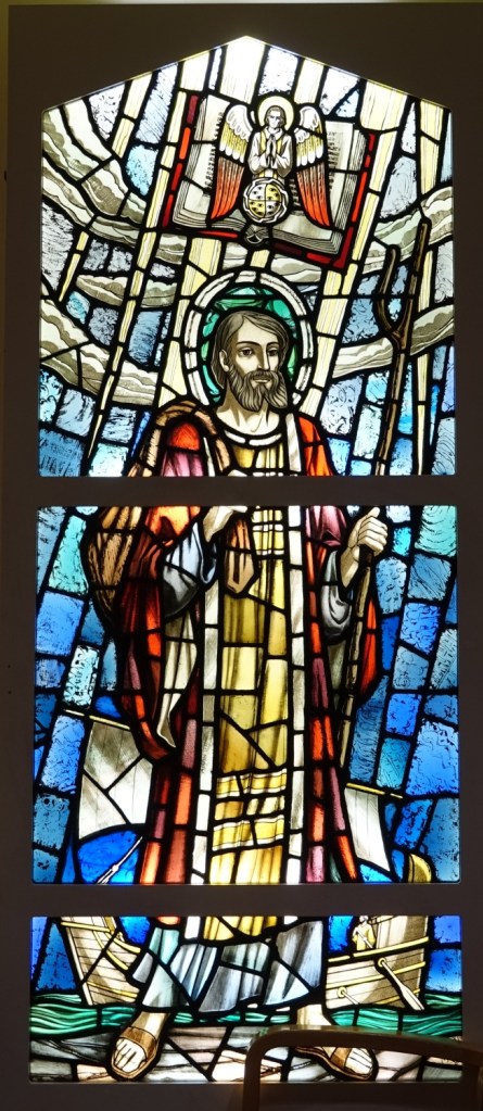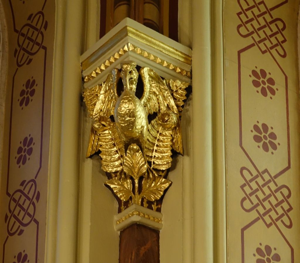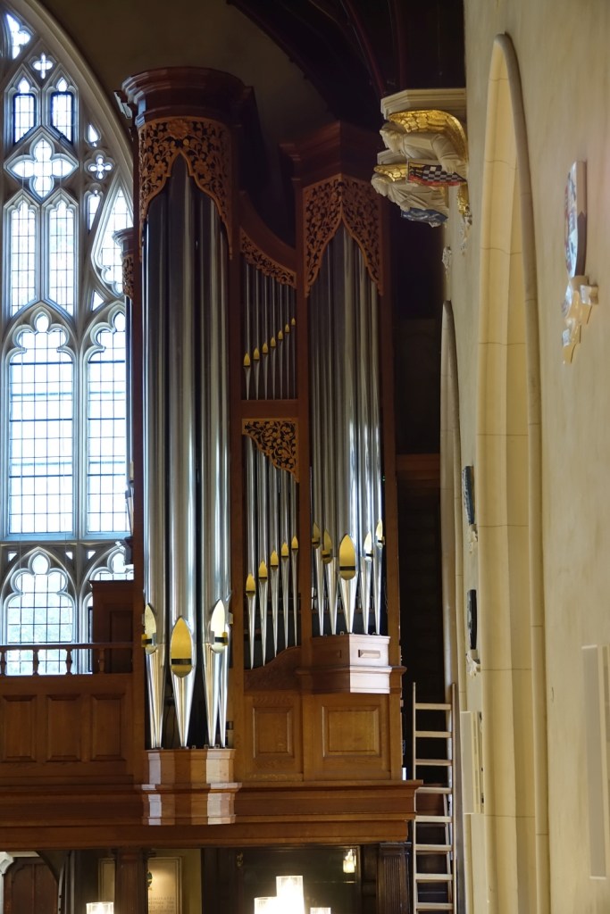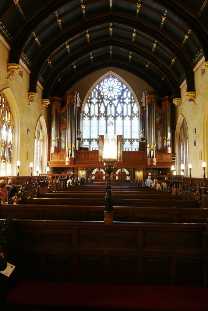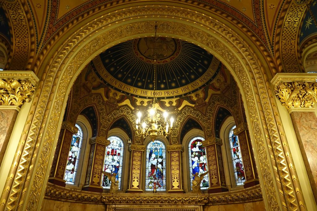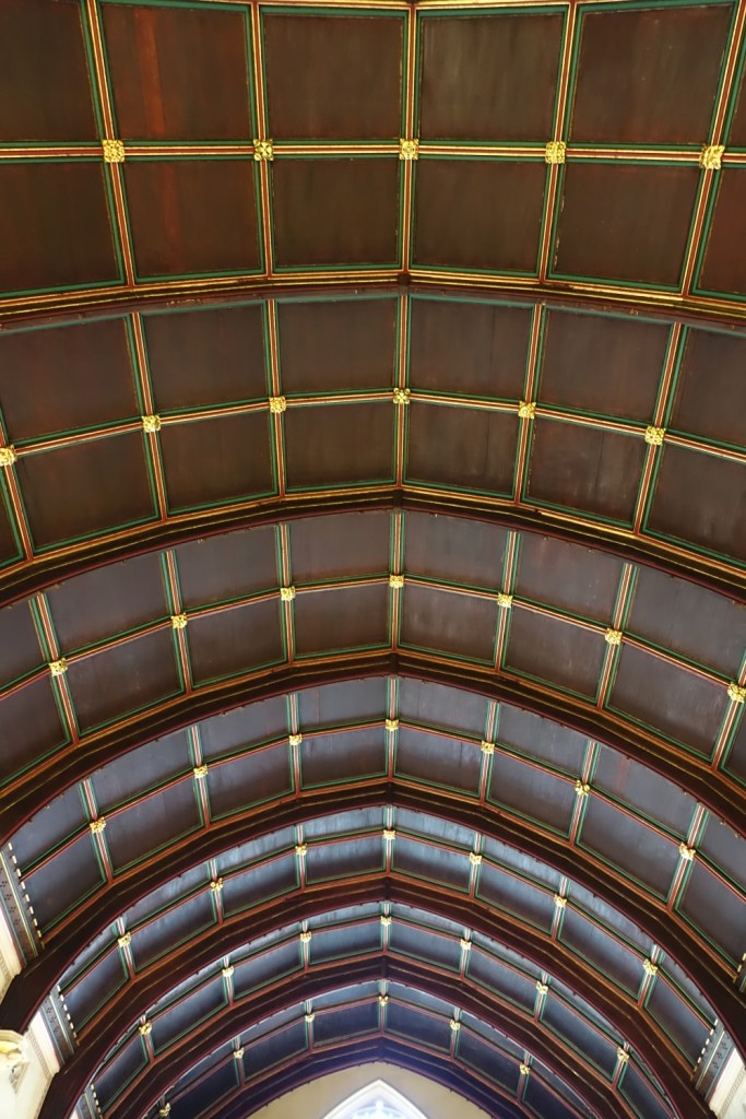 An insignificant-looking exterior, it was rebuilt by Edward Maufe after WW2 damage. Pre-war glass survives as it was taken out for protection and includes windows by Selwyn Image and Christopher Whall.
