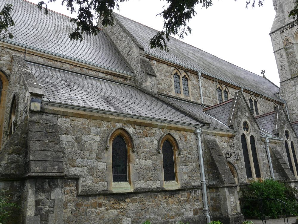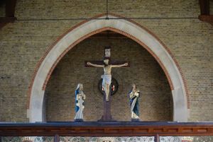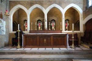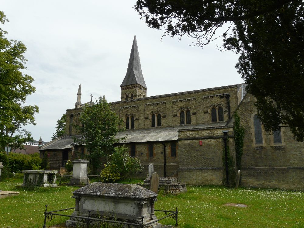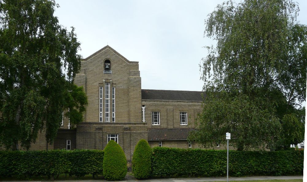 In quiet suburbia near the station, a church of 1939-41 by Cyril Farey. There are many windows by Margaret Edith Rope, a selection of which are shown here. The modern Stations of the Cross include the less usual 15th – Resurrection. The font comes from the former City church of St Katherine Coleman.