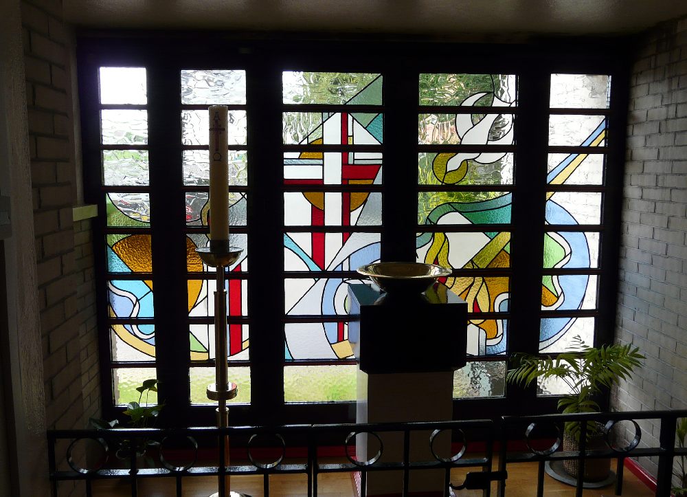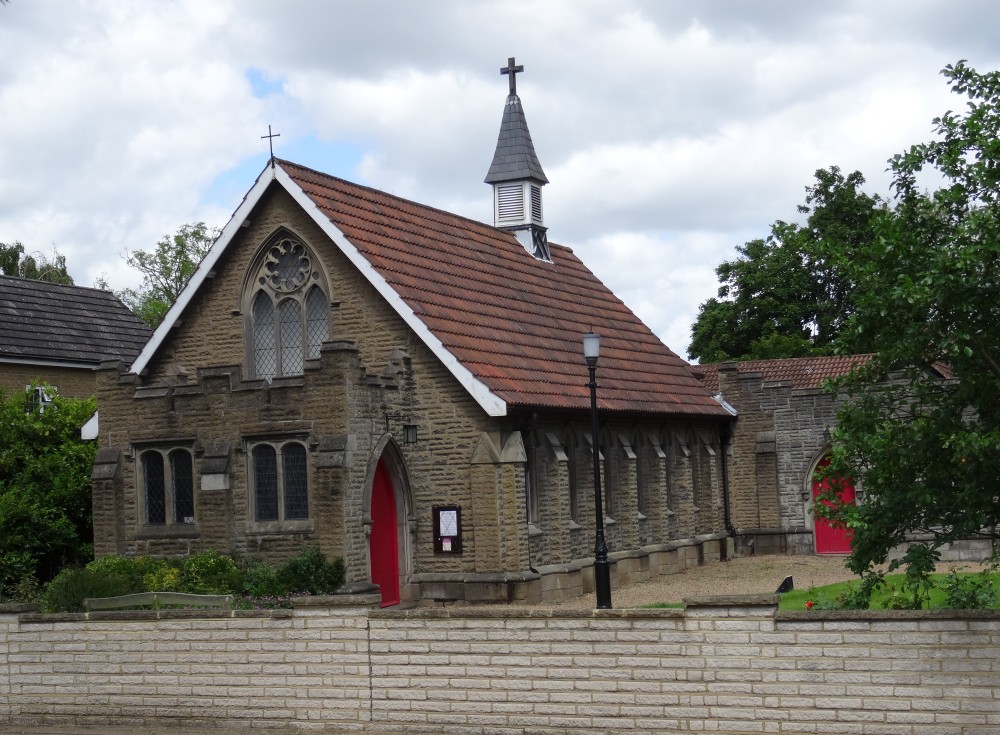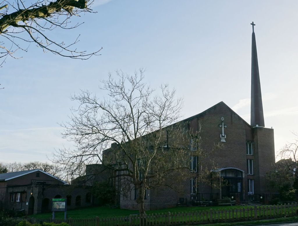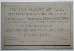 In quiet suburbia, a church of 1939 by Milner & Craze with the west end and tower added in 1965 by William Mulvey. The side chapel window is by Alfred Fisher.