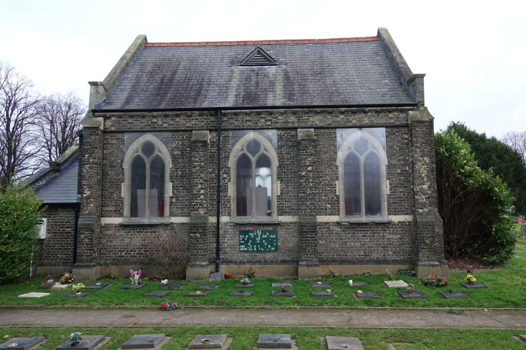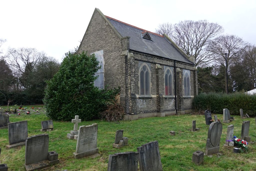 The small cemetery chapel in Hertford Road cemetery, just behind the churchyard of St James, Enfield Wash. Before being used by the Greek Orthodox Church it was boarded up for many years. The cemetery was opened in 1880 so it seems likely that the chapel is of the same date.