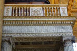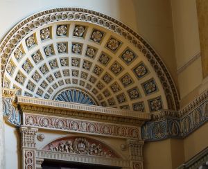 Part of the Queen Mary block of the hospital, it is a major work planned by Christopher Wren but construction was delayed and dates from 1735-1743. The chapel is entered up a high curved staircase from an entrance area that contains most of the monuments in the chapel. The interior was severely fire damaged and rebuilt by James Stuart in 1779-1789 in his Greek style.