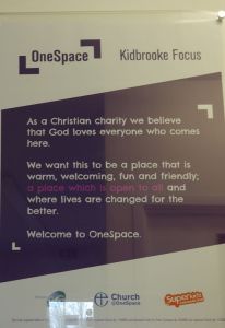 One Space is a Christian community centre on the edge of the Kidbrooke Village development. The building has a cafe and hall as well as offices. Several religious groups use the hall and the Anglican church has used the cafe (illustrated) as Kidbrooke Village Church for services. Currently, Messy Church (March 2019) seems to be the only Anglican event here.