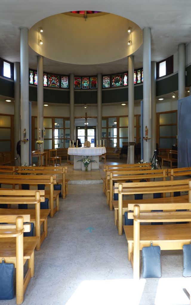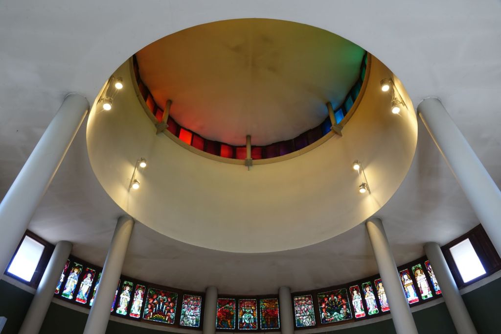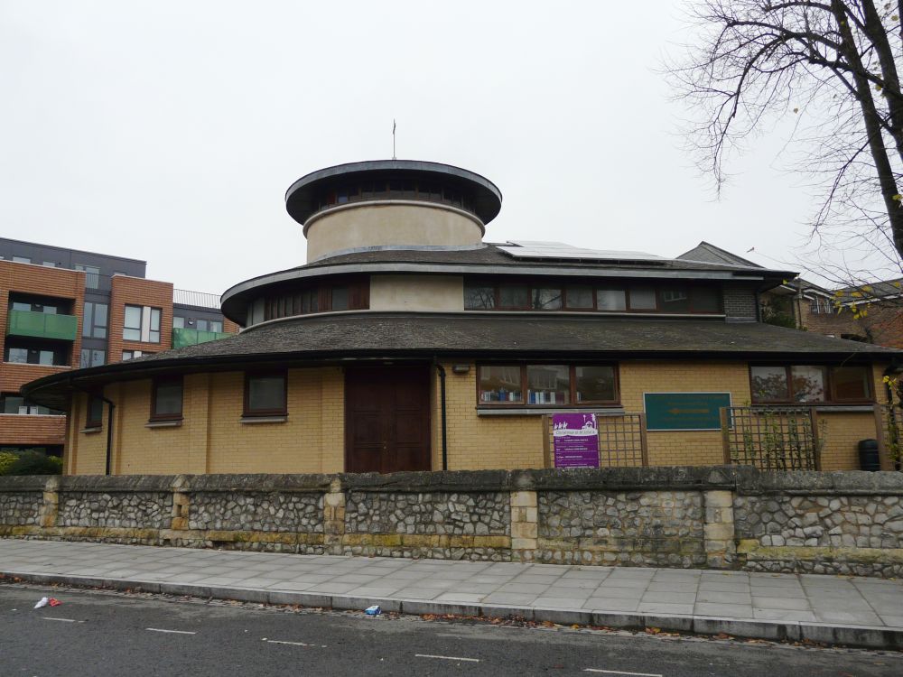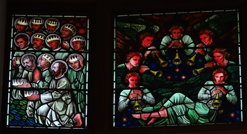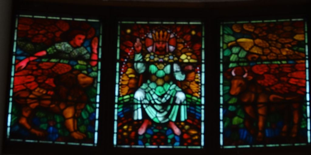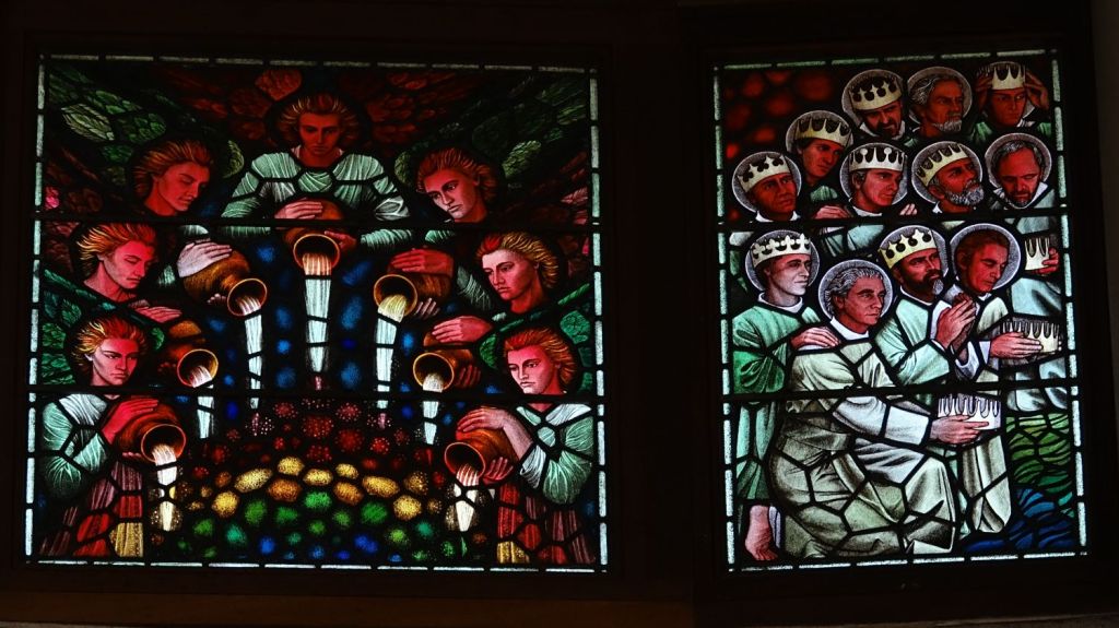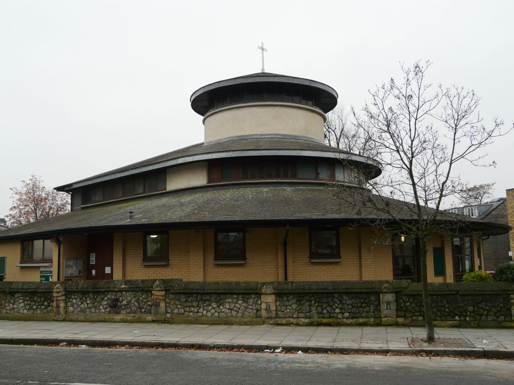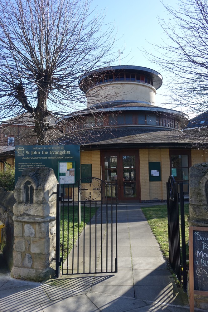 Near Finsbury Park, a semi-circular “flying saucer” design by Tom Hornsby dating from 1995. It replaced a 19th century church on the same site. The saints are reset glass from the former church, the other windows showing the Apocalyptic Visions of St. John are by Meg Lawrence from 1996 (apologies for one being a bit out of focus).