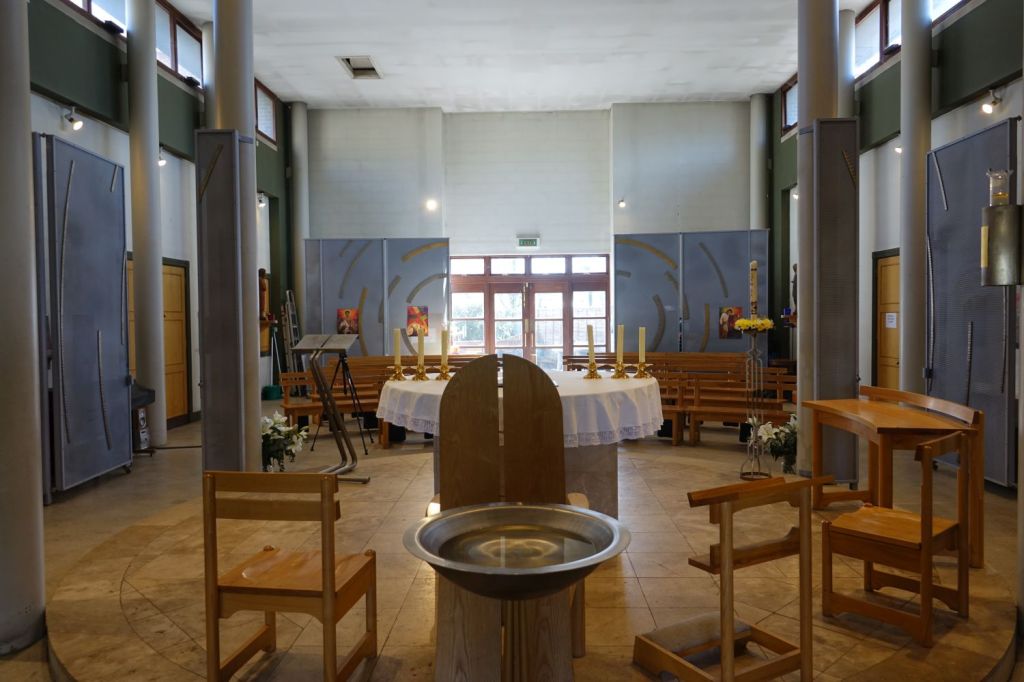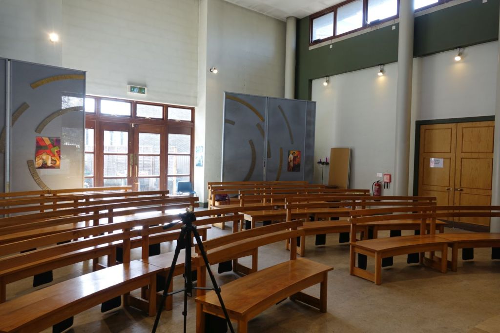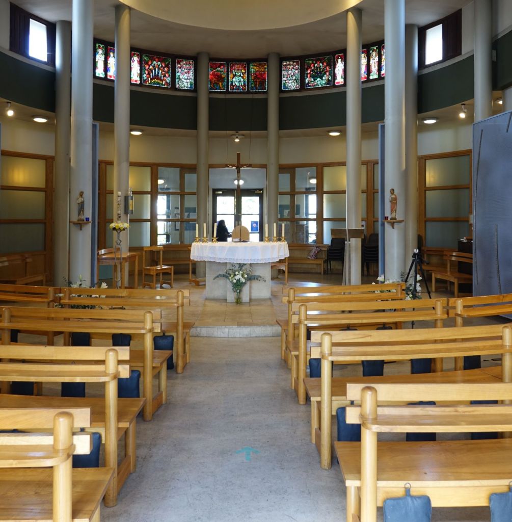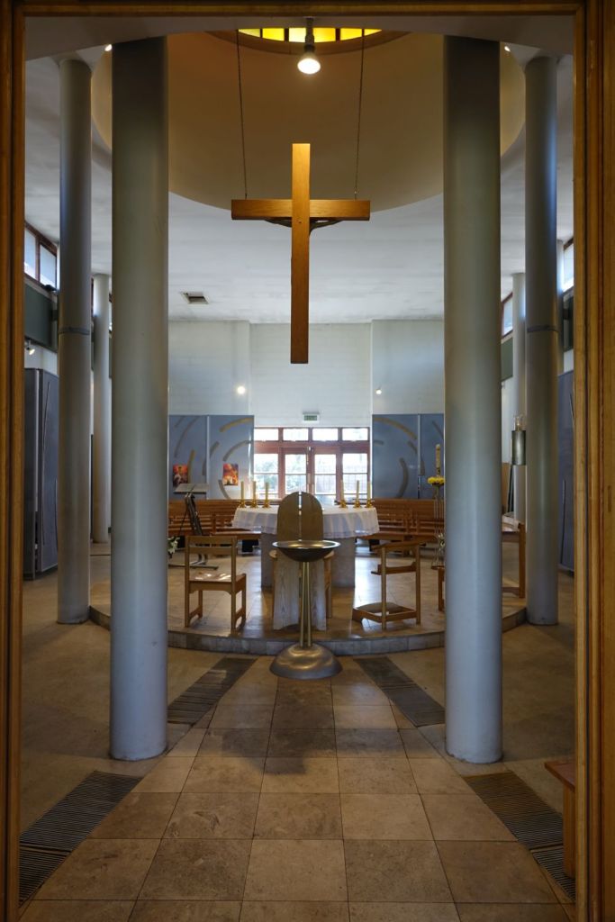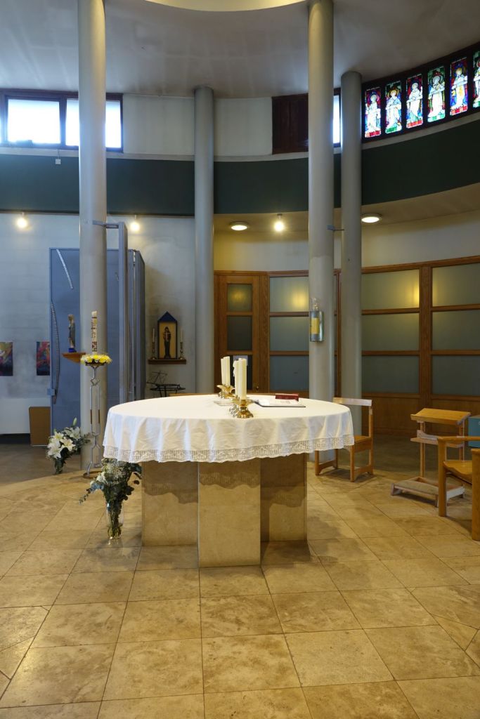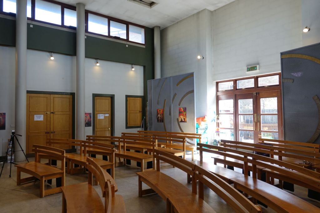 Near Finsbury Park, a semi-circular “flying saucer” design by Tom Hornsby dating from 1995. It replaced a 19th century church on the same site. The saints are reset glass from the former church, the other windows showing the Apocalyptic Visions of St. John are by Meg Lawrence from 1996 (apologies for one being a bit out of focus).