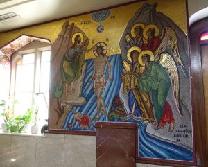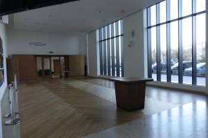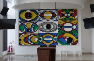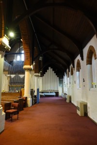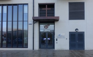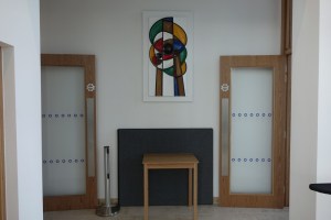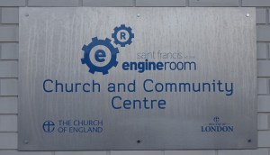 Lee Valley Estates, the developers, provided an area on the ground floor of one of the housing blocks on a 500 year lease. This is called the Engine Room and as well as a worship area offers halls, rooms and a cafe. The triptych called “The Eternal Engine” and the Stations of the Cross paintings (15 rather than the traditional 14 as there is an extra called Resurrection) were created by Graeme Mortimer Evelyn. Towards the back of the church is an underfloor full immersion font.