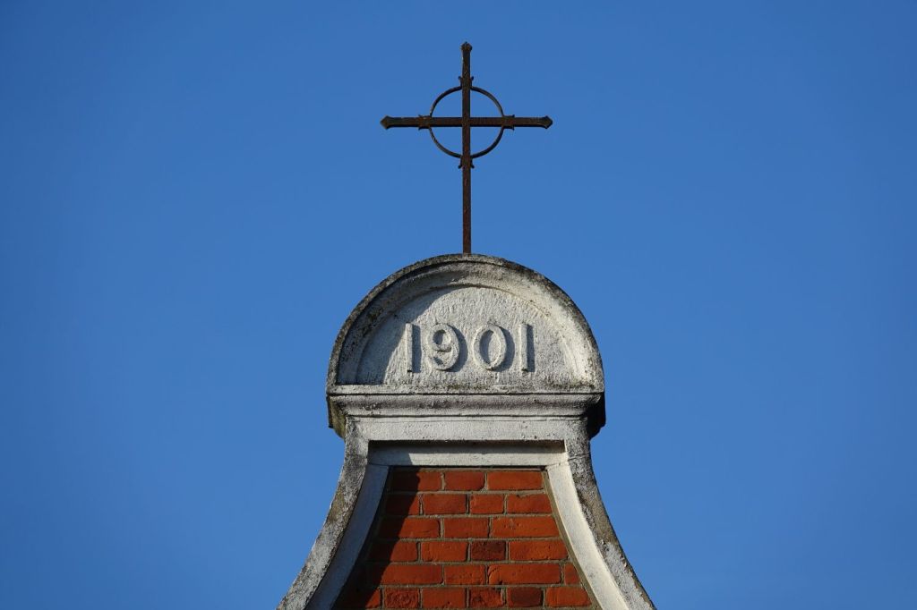 A small church nestled into a corner on a street of housing. The church was built in 1901, with a chancel (not visible from the street) added in 1935.