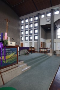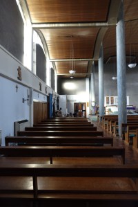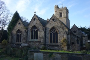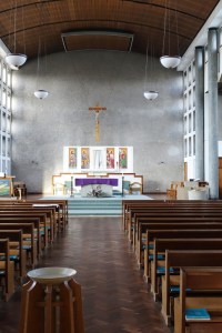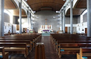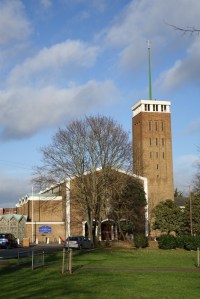 On the eastern side of Hanworth Park. A church by N.F. Cachemaille-Day. The Lady Chapel and baptistery date from 1951-52 (Shown at the end), the main body of the church and circular section were built in 1957. The figurative glass by Goddard & Gibbs is in the Lady Chapel. Cachemaille-Day also designed the Seven Sacraments font.