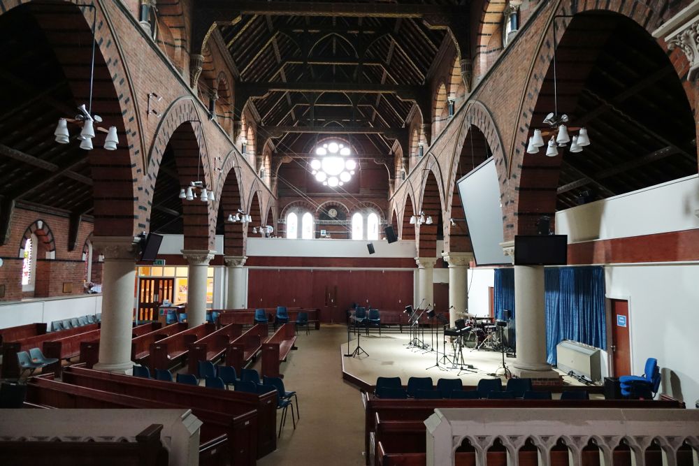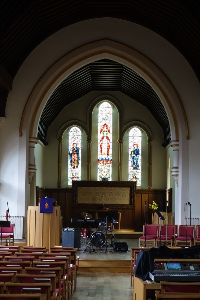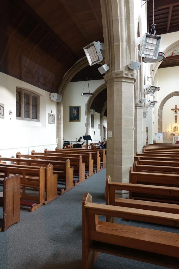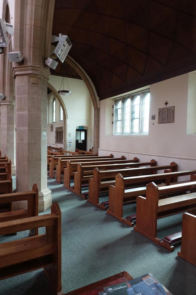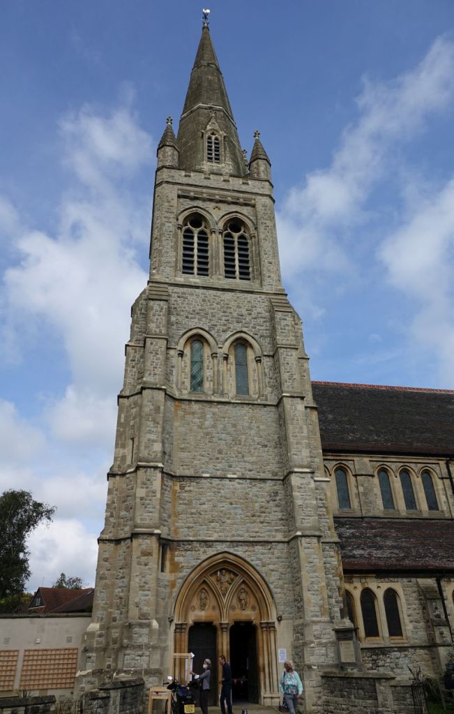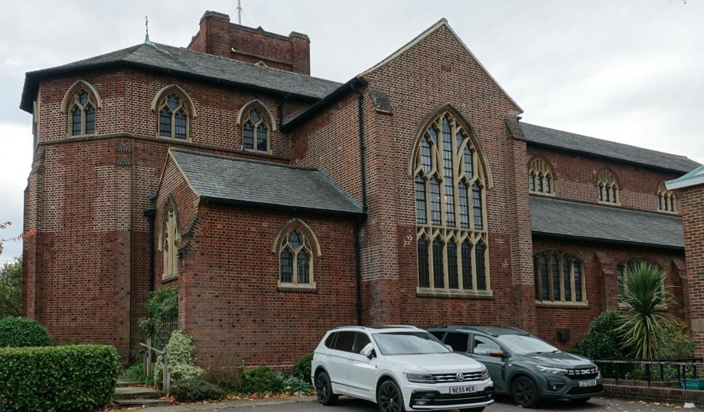 A landmark on the approach from the South to Surbiton. It is a design by C.L. Luck from 1874-75. The aisles were partitioned off in 1976. The east windows are by Hugh Easton, the former baptistry by Louis Davis and the south transept by W. Carter Shapland.