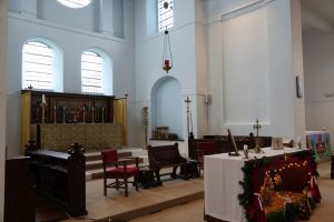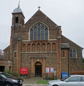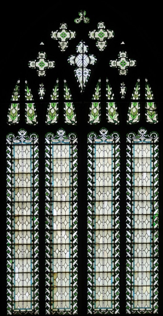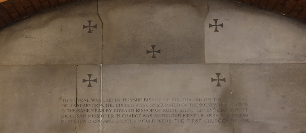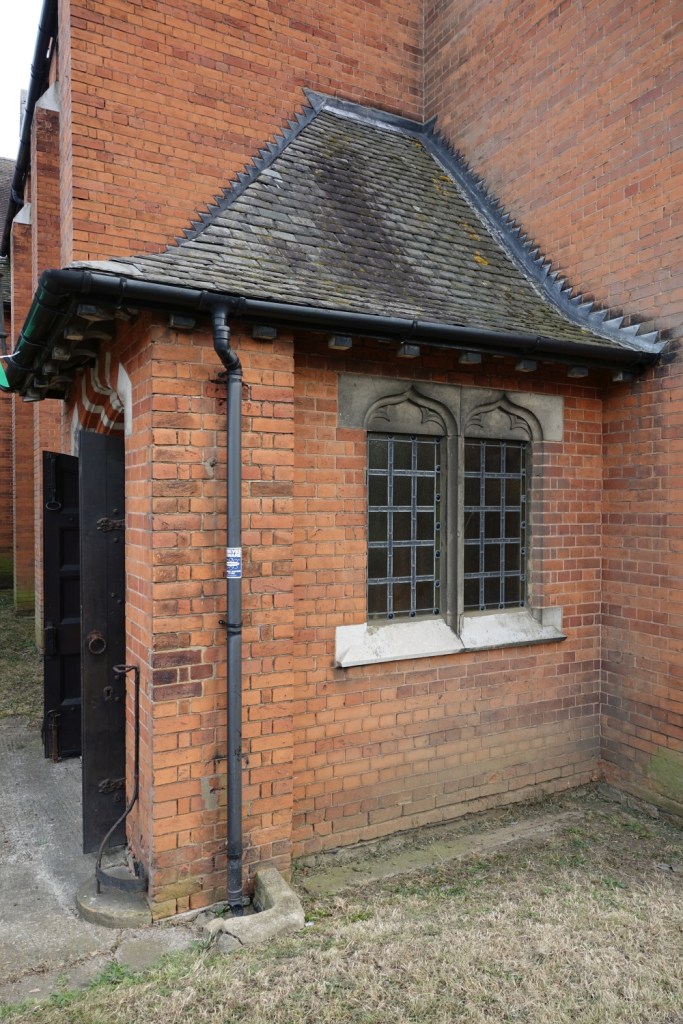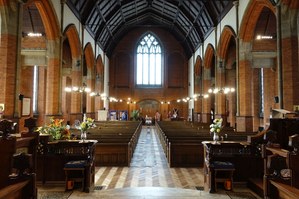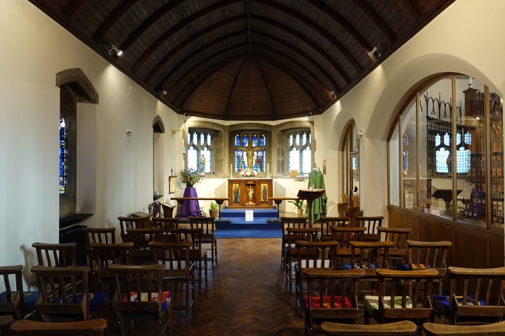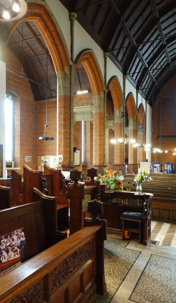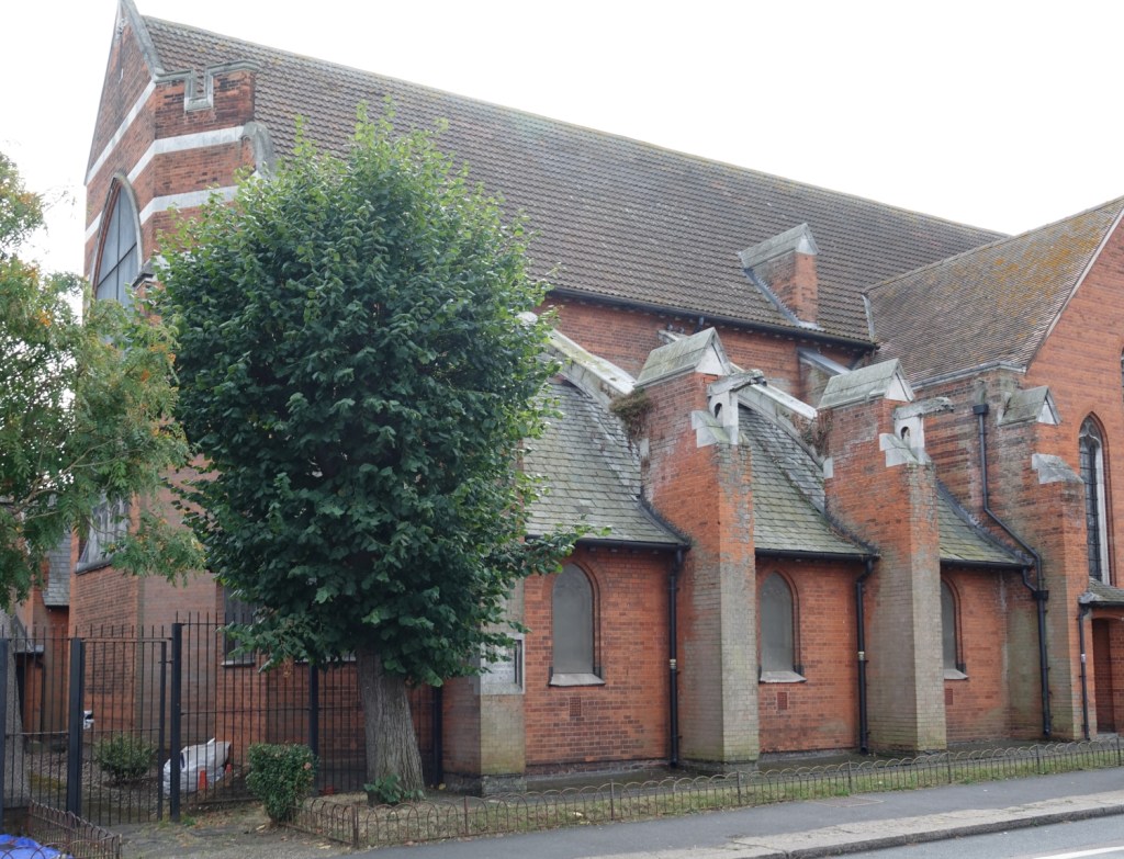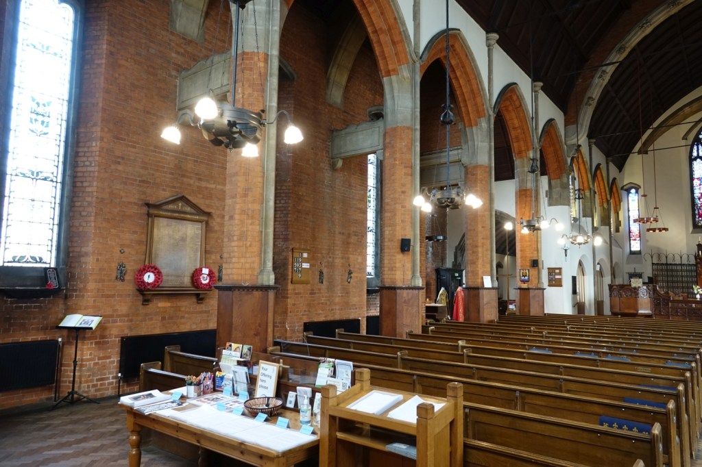 A large church of 1878-1879 by H. Elliott. Inside the sanctuary is being used as a storage area and is curtained off from the current altar platform. The 3 single light windows in the side chapel are the final work of Wilhelmina Geddes, dating from 1951, the apse windows are by William Morris (no relation) of Westminster from 1954, all replacing older glass blown out in the war. A cartoon of the original apse windows is on show in the church. The one complete pre-war window is by Heaton, Butler & Bayne.
