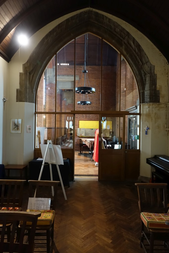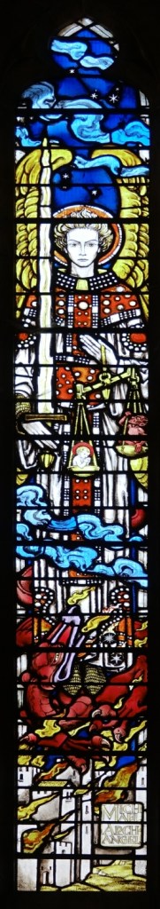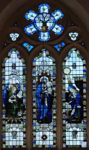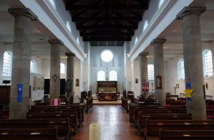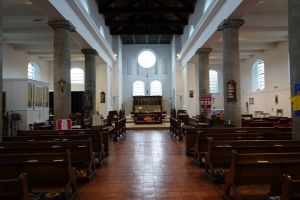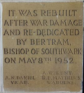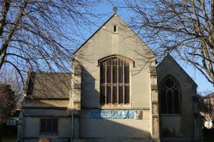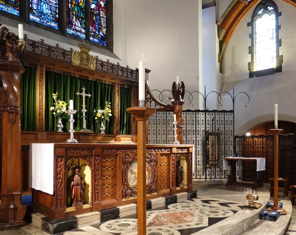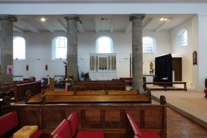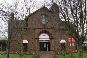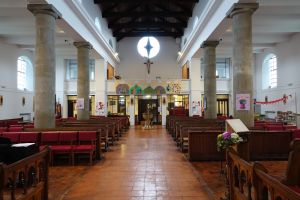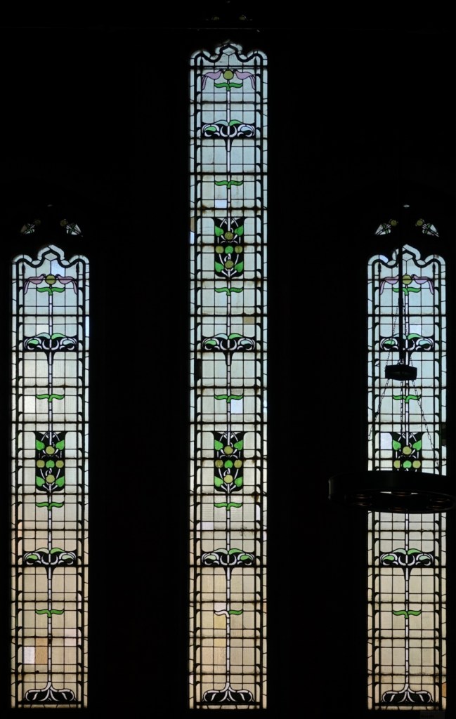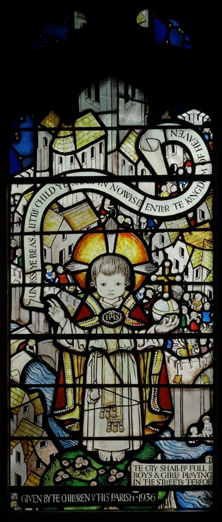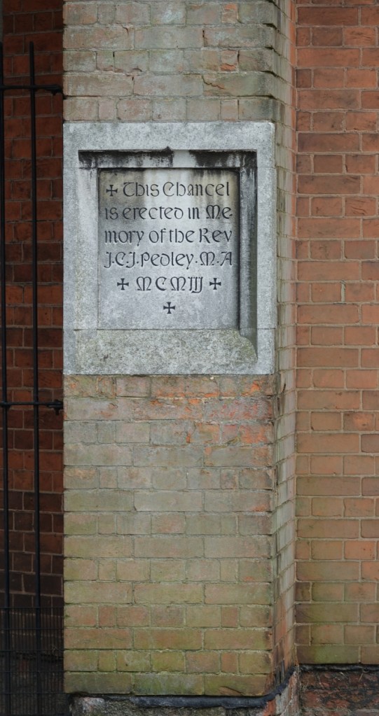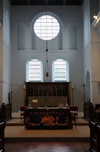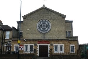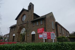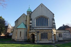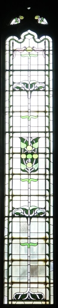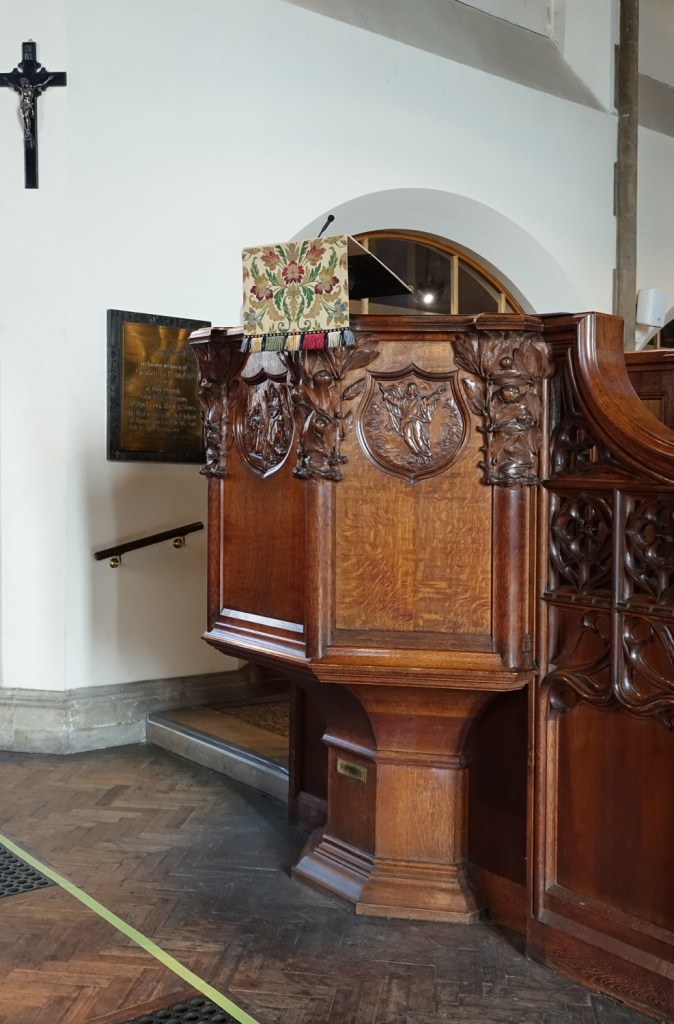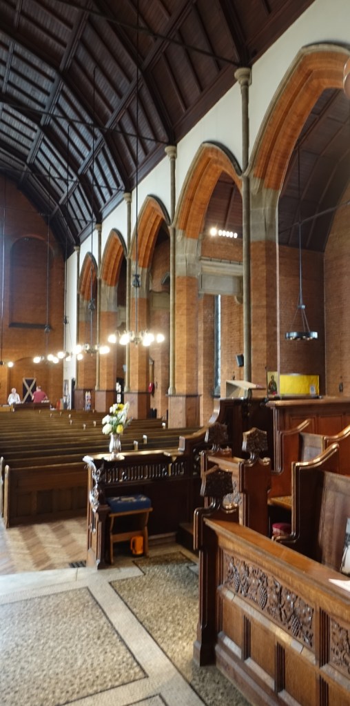 A large church of 1878-1879 by H. Elliott. Inside the sanctuary is being used as a storage area and is curtained off from the current altar platform. The 3 single light windows in the side chapel are the final work of Wilhelmina Geddes, dating from 1951, the apse windows are by William Morris (no relation) of Westminster from 1954, all replacing older glass blown out in the war. A cartoon of the original apse windows is on show in the church. The one complete pre-war window is by Heaton, Butler & Bayne.