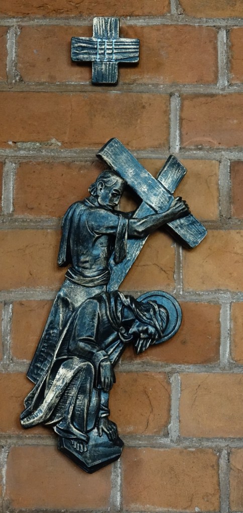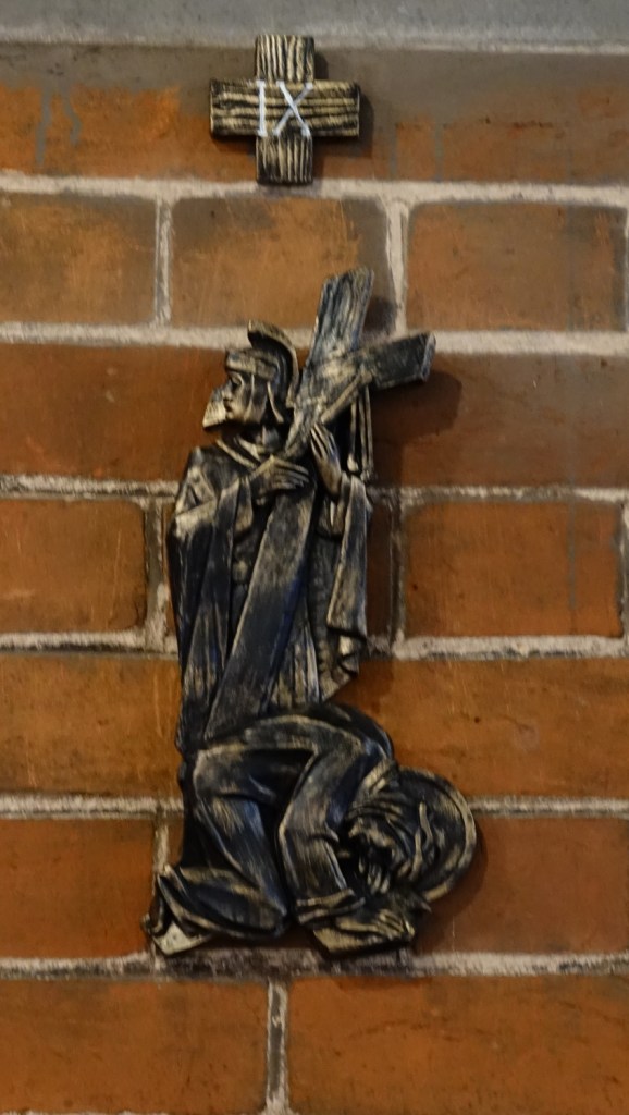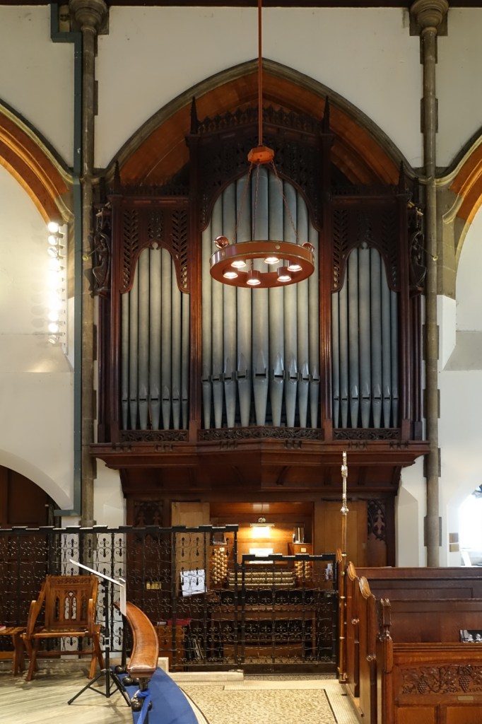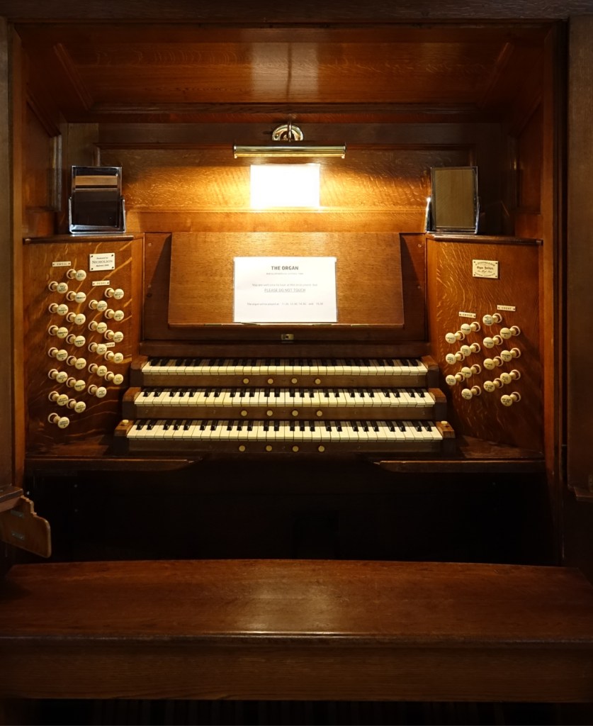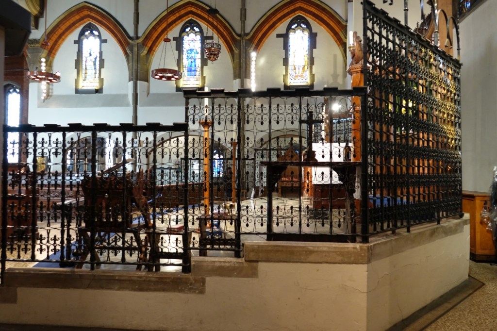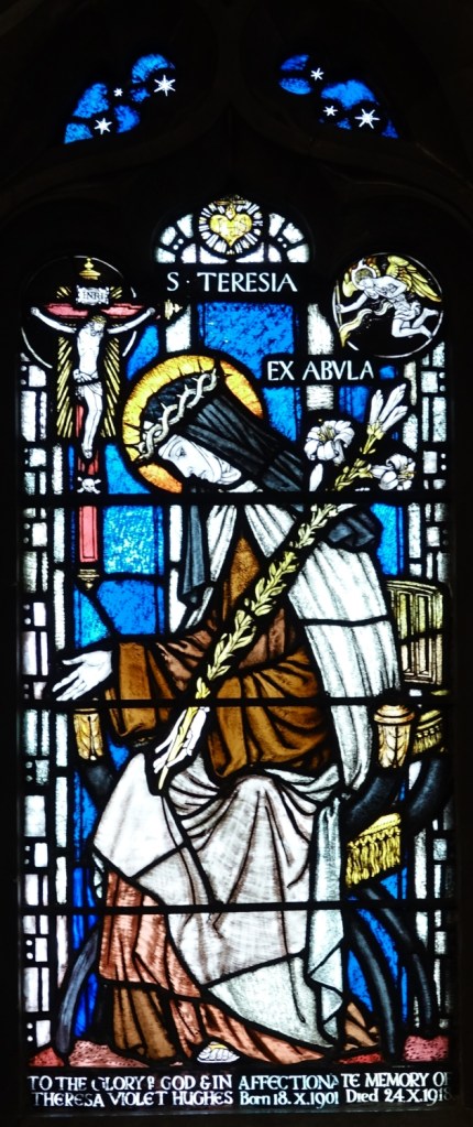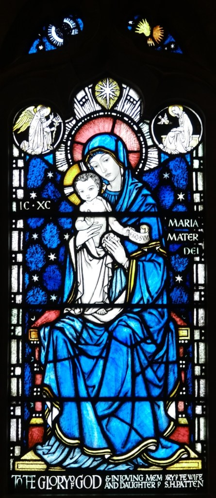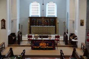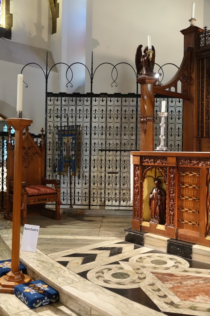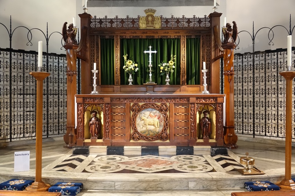 A large church of 1878-1879 by H. Elliott. Inside the sanctuary is being used as a storage area and is curtained off from the current altar platform. The 3 single light windows in the side chapel are the final work of Wilhelmina Geddes, dating from 1951, the apse windows are by William Morris (no relation) of Westminster from 1954, all replacing older glass blown out in the war. A cartoon of the original apse windows is on show in the church. The one complete pre-war window is by Heaton, Butler & Bayne.