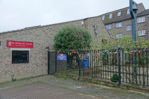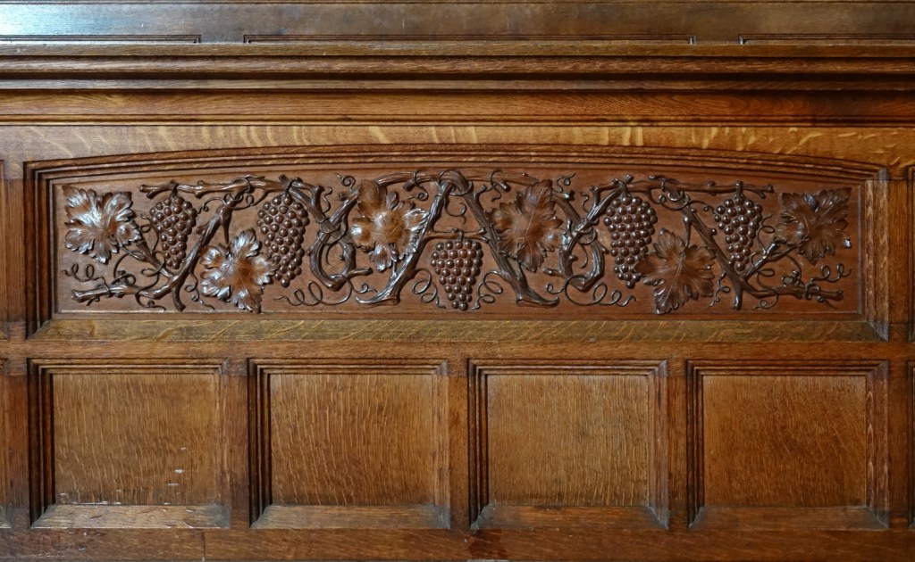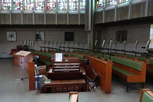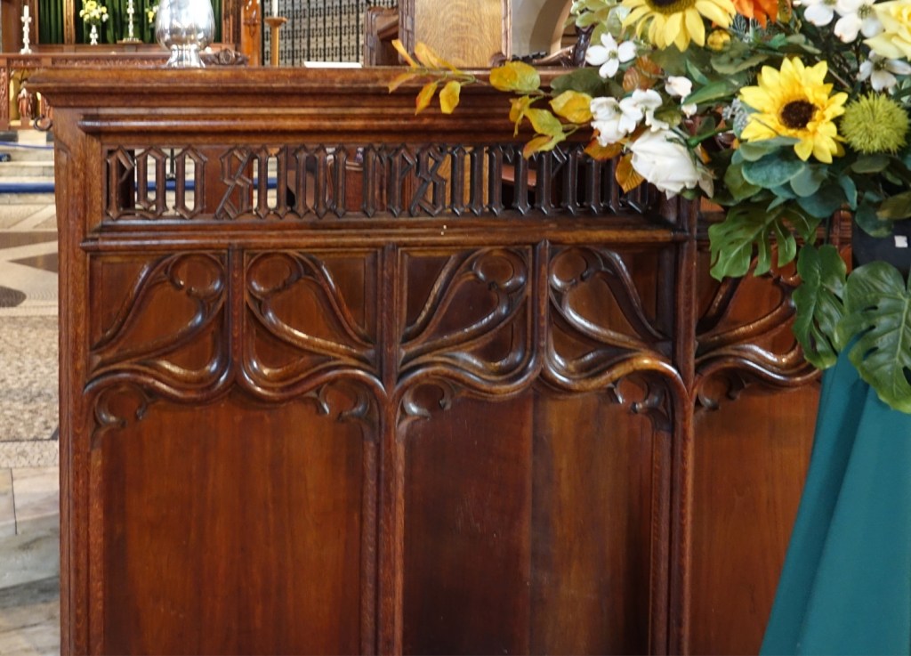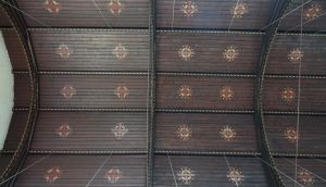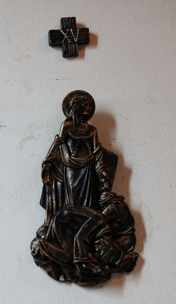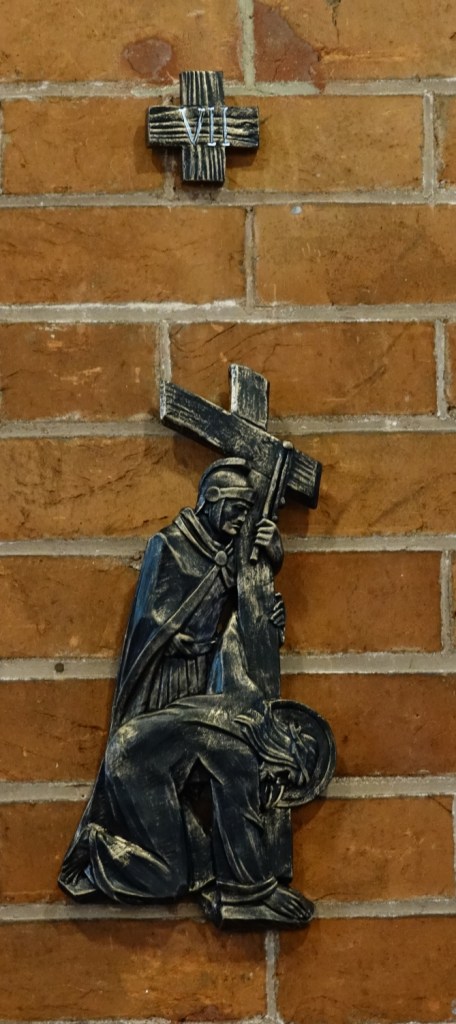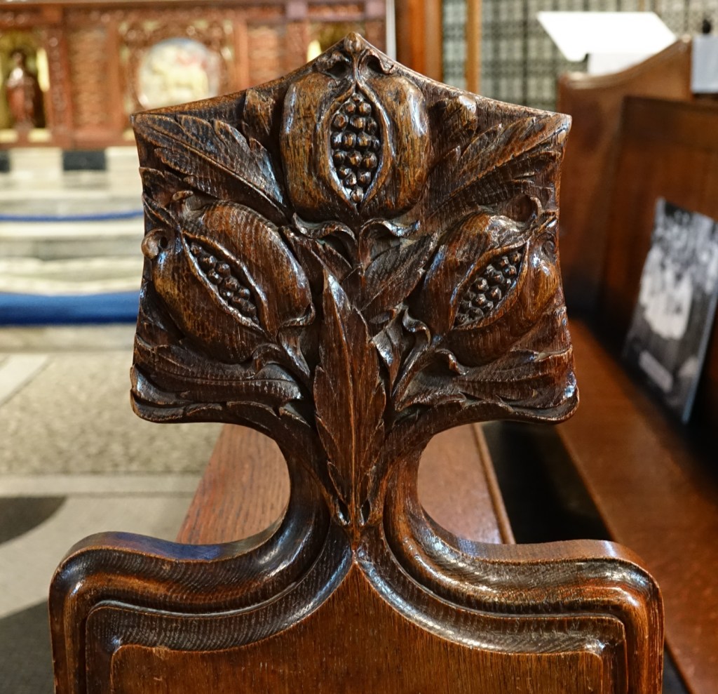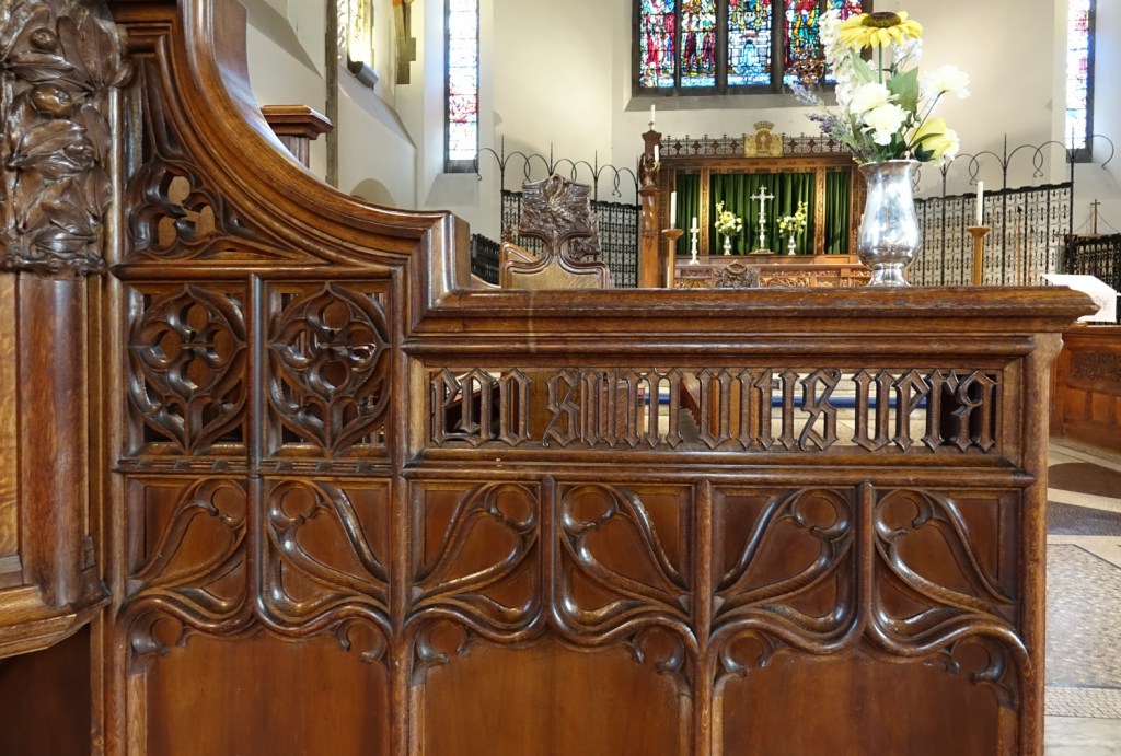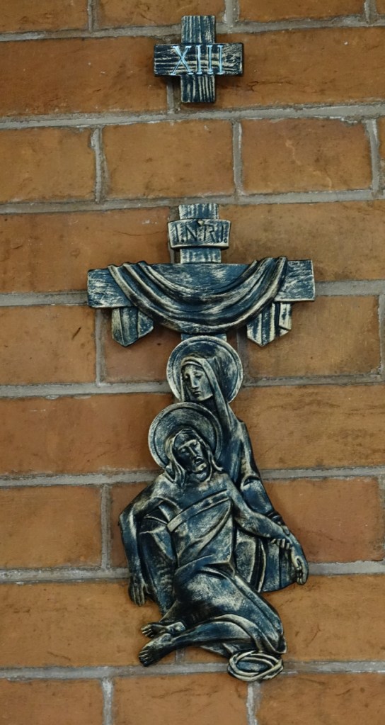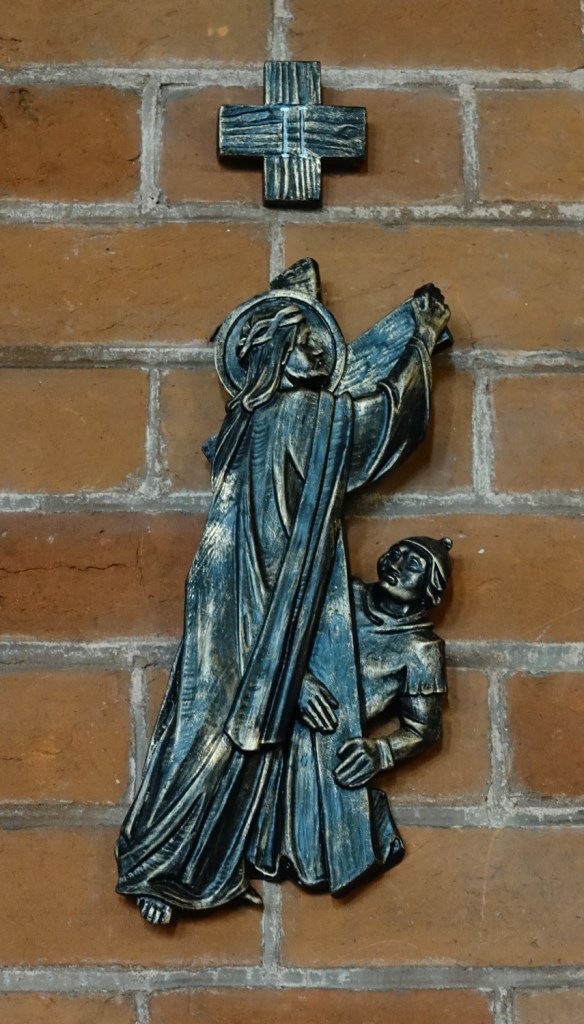 A large church of 1878-1879 by H. Elliott. Inside the sanctuary is being used as a storage area and is curtained off from the current altar platform. The 3 single light windows in the side chapel are the final work of Wilhelmina Geddes, dating from 1951, the apse windows are by William Morris (no relation) of Westminster from 1954, all replacing older glass blown out in the war. A cartoon of the original apse windows is on show in the church. The one complete pre-war window is by Heaton, Butler & Bayne.