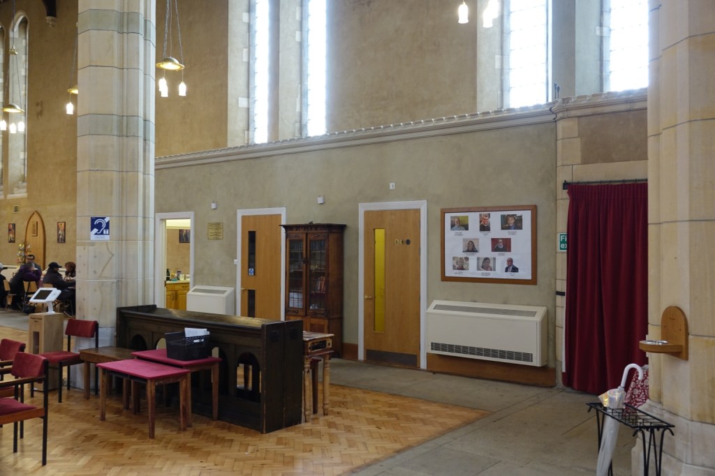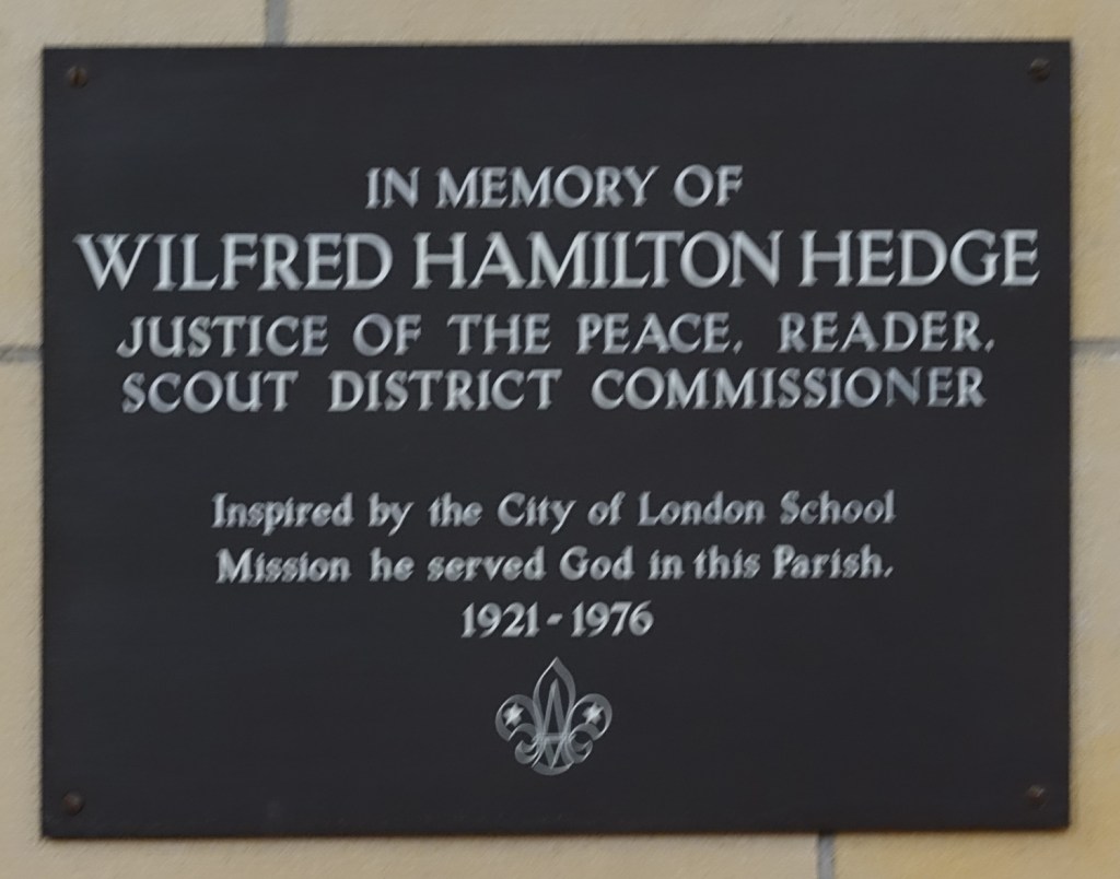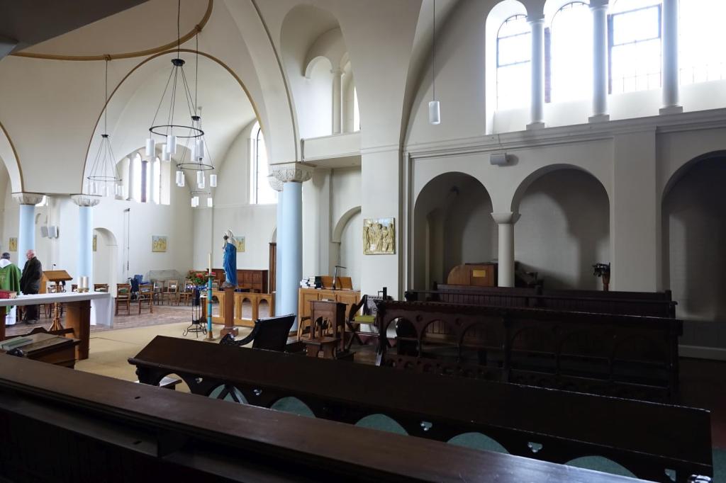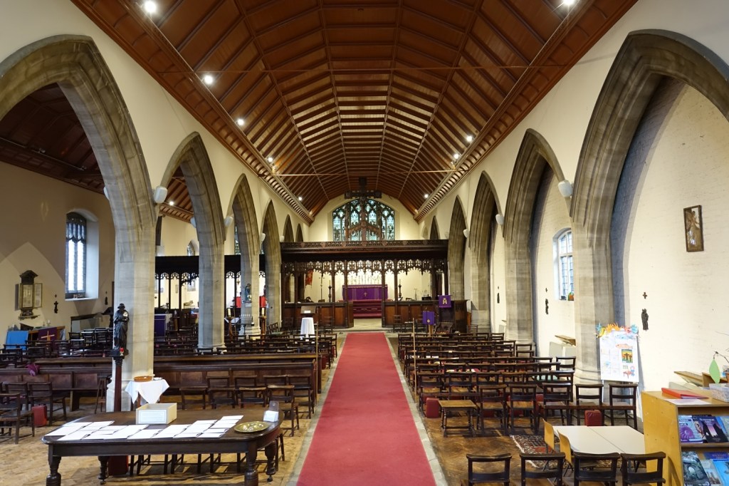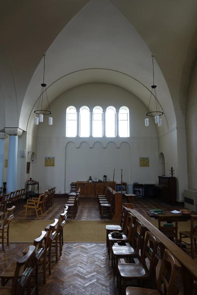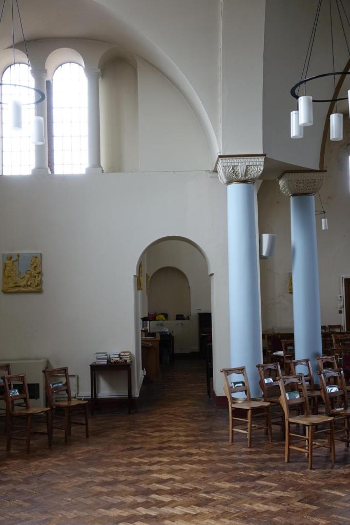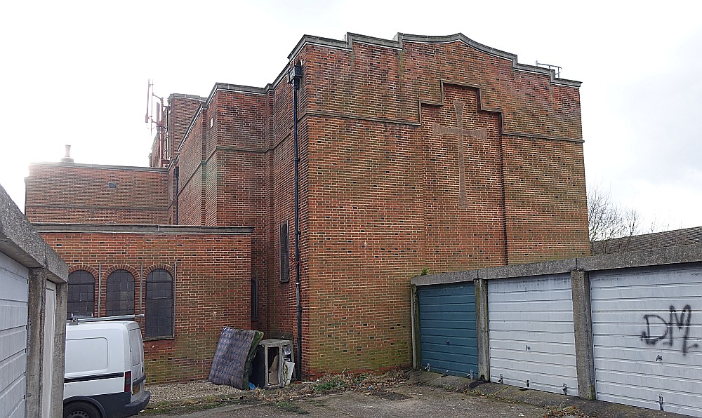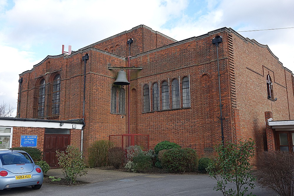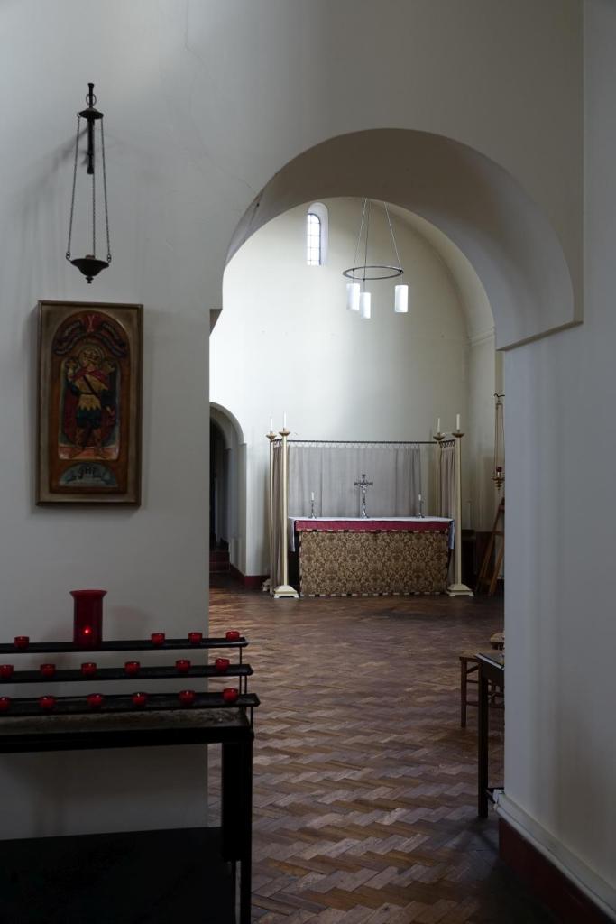 At the end of two dead end roads, a church of 1931 by A.C. Martin. It was financed by the sale of the suite of St Olave, Tooley St in Southwark. The pulpit and font were brought from that church. The west porch was added to the “temporarily finished” west end in the 1960s.