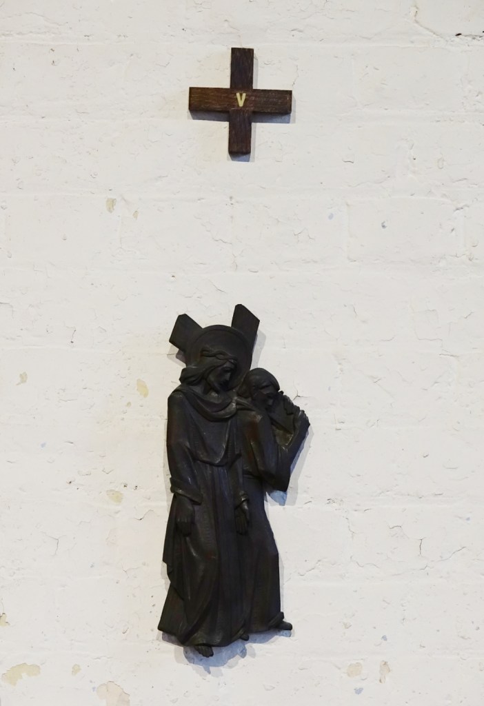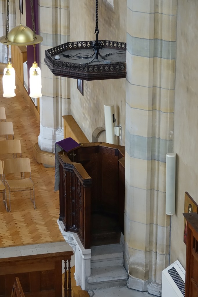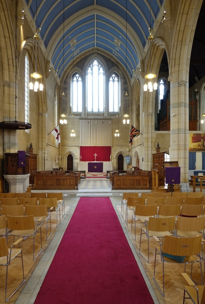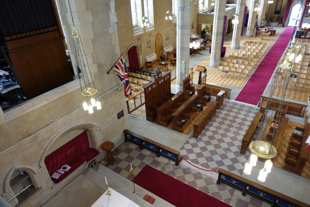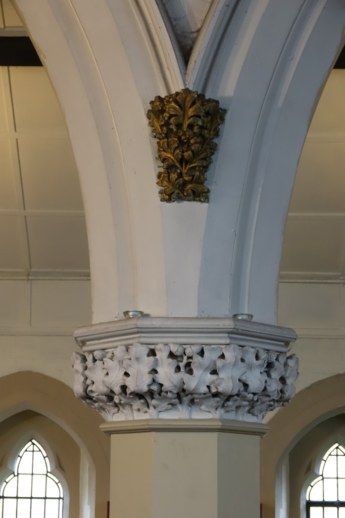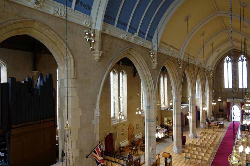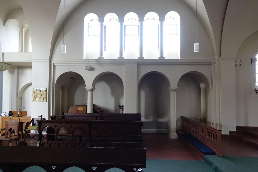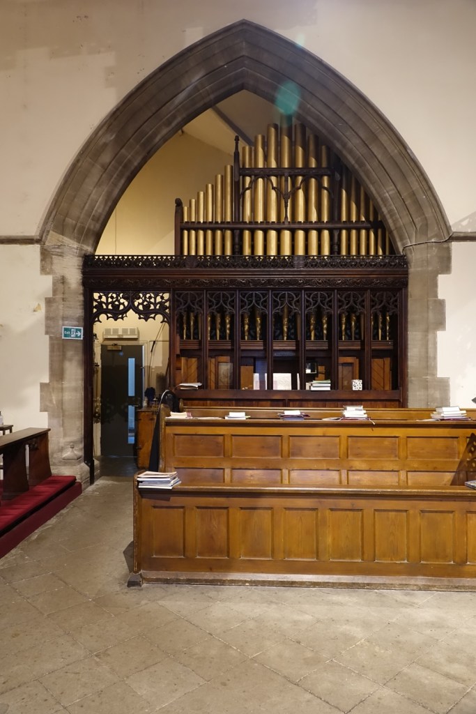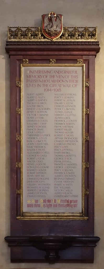 At the end of two dead end roads, a church of 1931 by A.C. Martin. It was financed by the sale of the suite of St Olave, Tooley St in Southwark. The pulpit and font were brought from that church. The west porch was added to the “temporarily finished” west end in the 1960s.