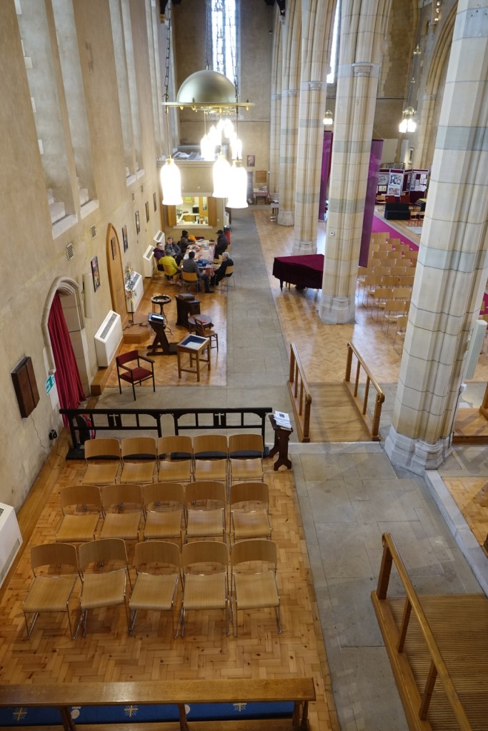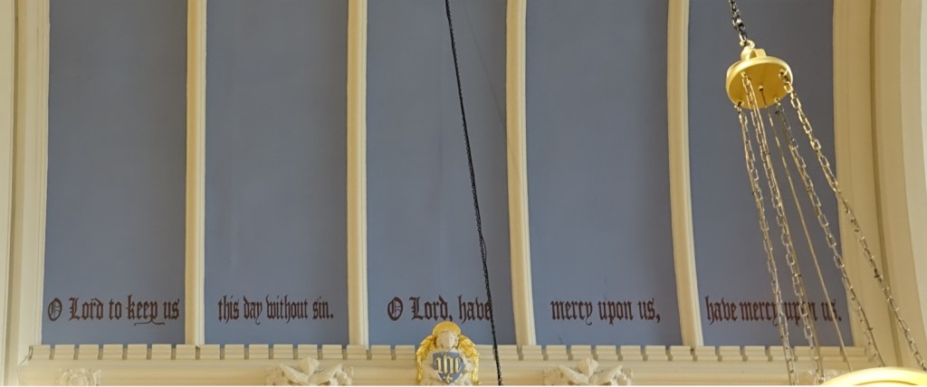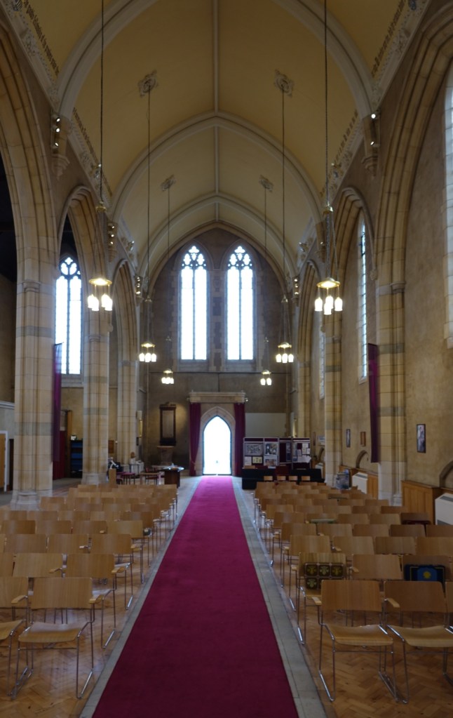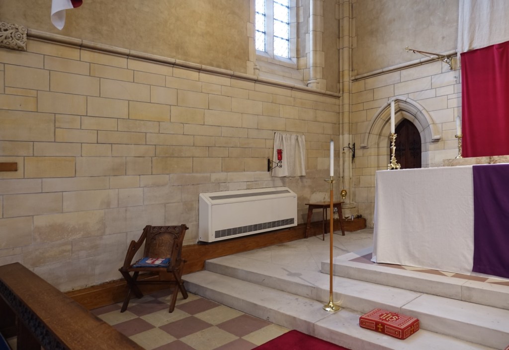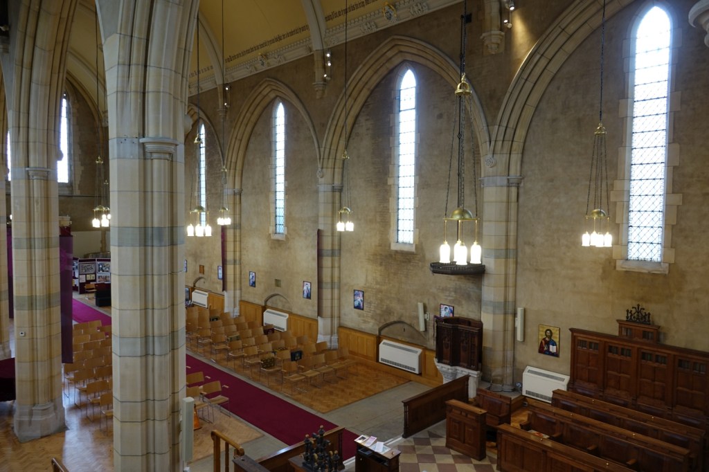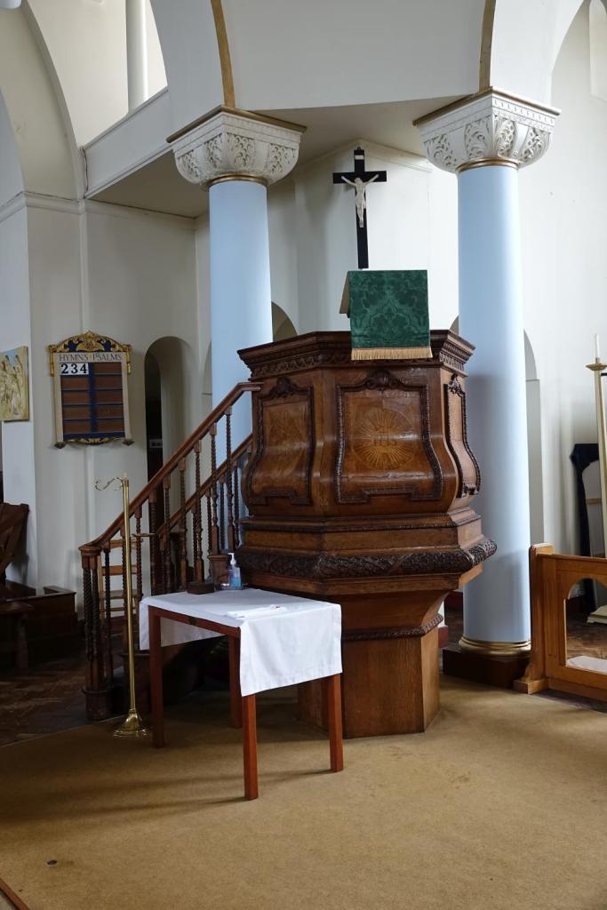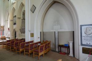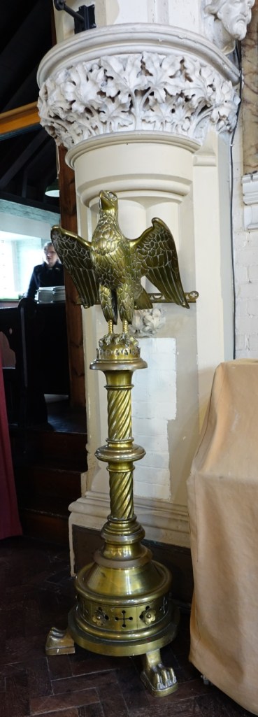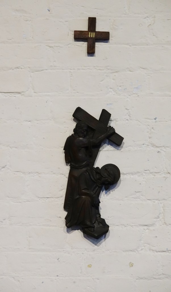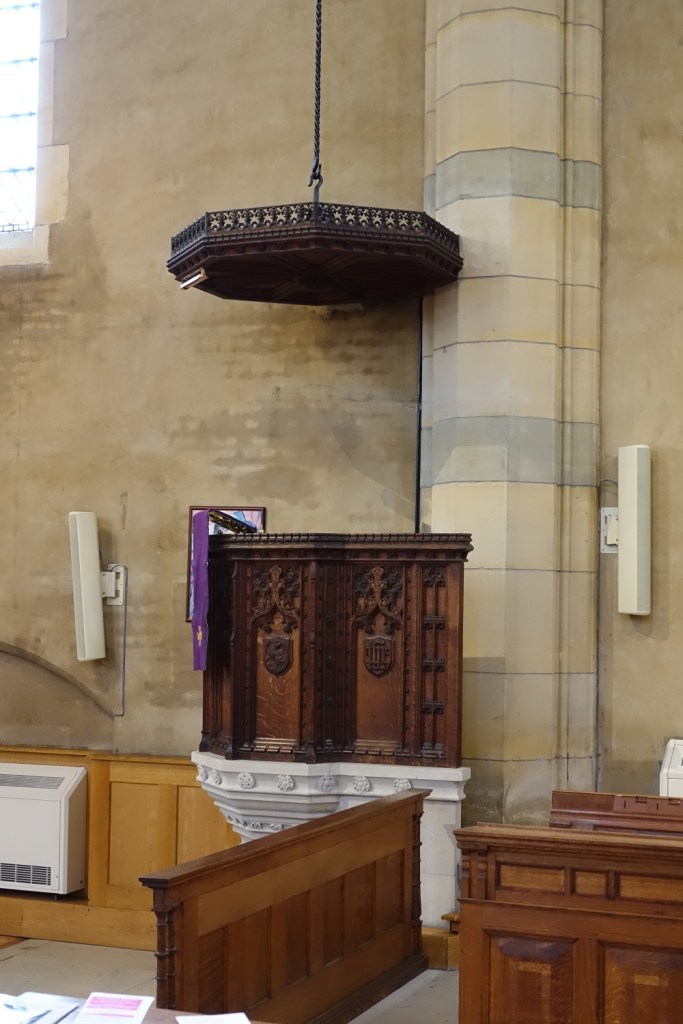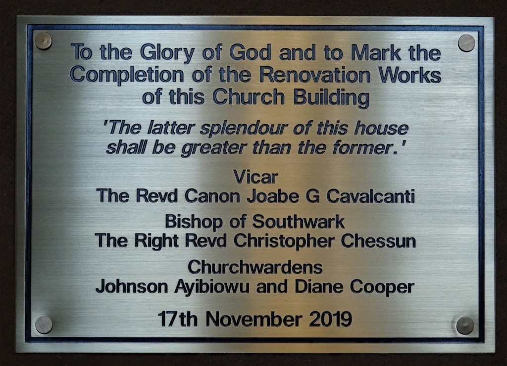 At the end of two dead end roads, a church of 1931 by A.C. Martin. It was financed by the sale of the suite of St Olave, Tooley St in Southwark. The pulpit and font were brought from that church. The west porch was added to the “temporarily finished” west end in the 1960s.