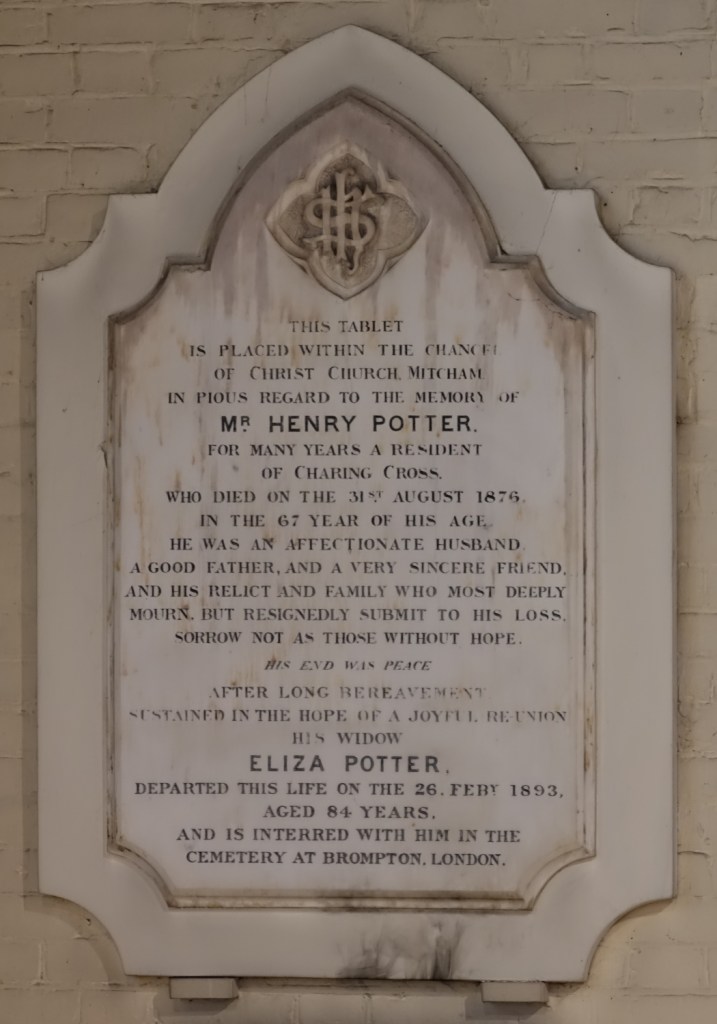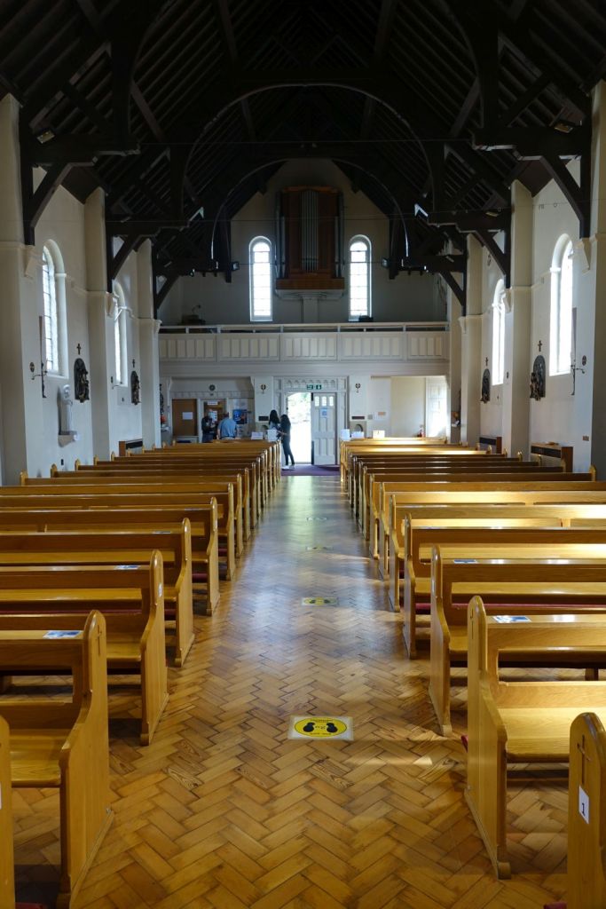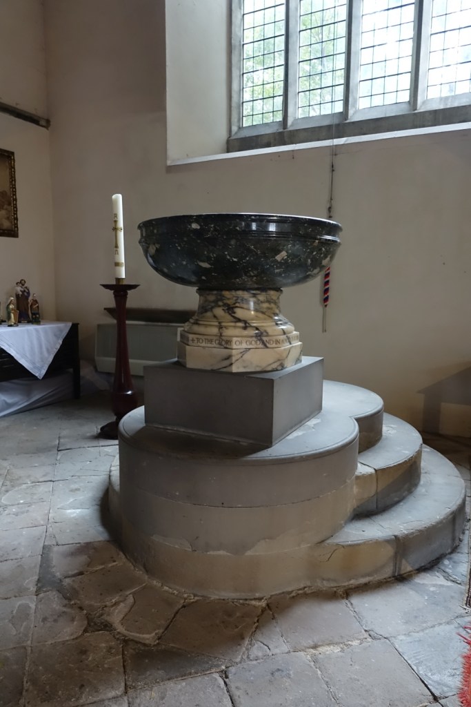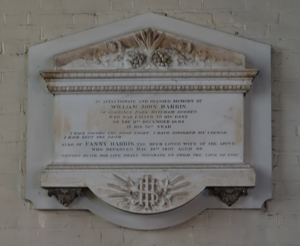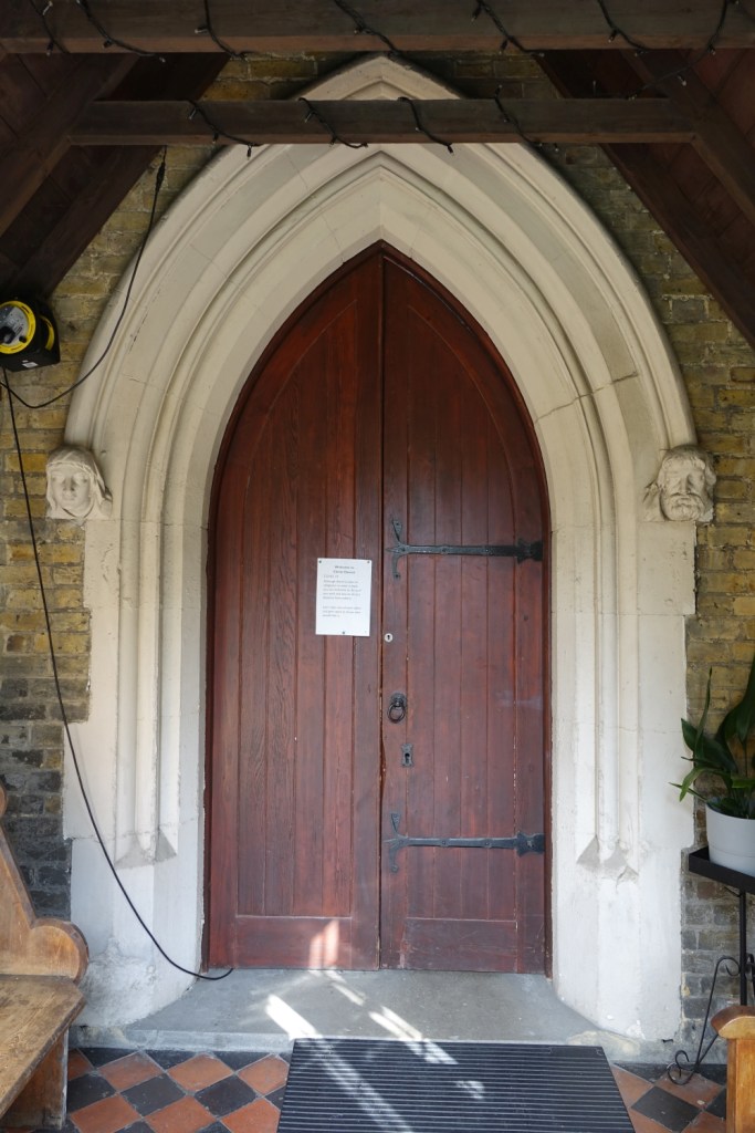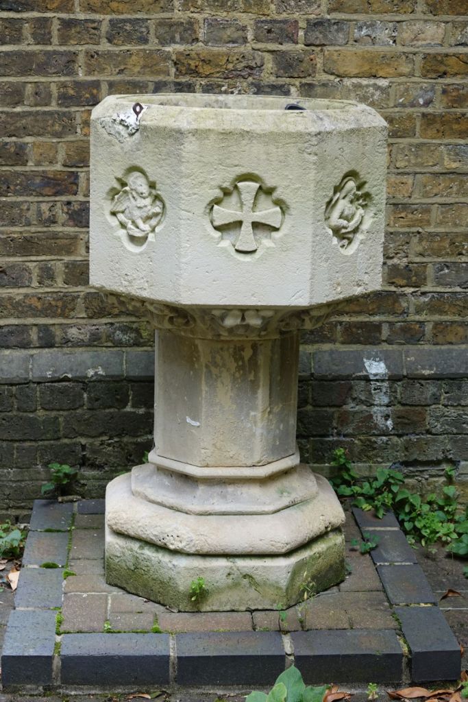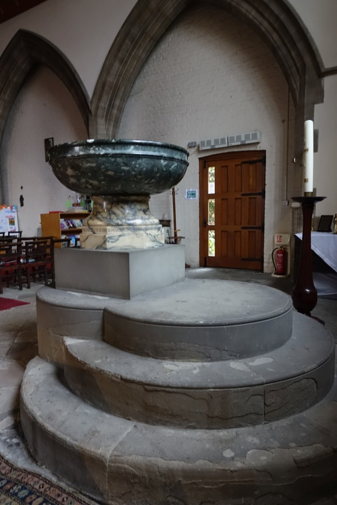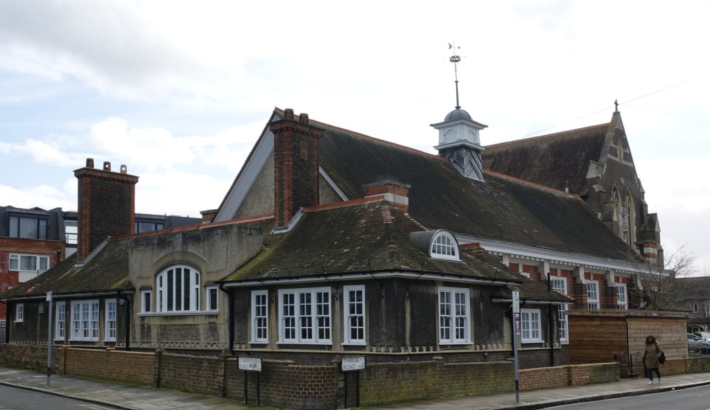 Facing Mitcham Green, this is a small church of 1888 by F.A. Walters. The font now sits outside in the garden at the east end.